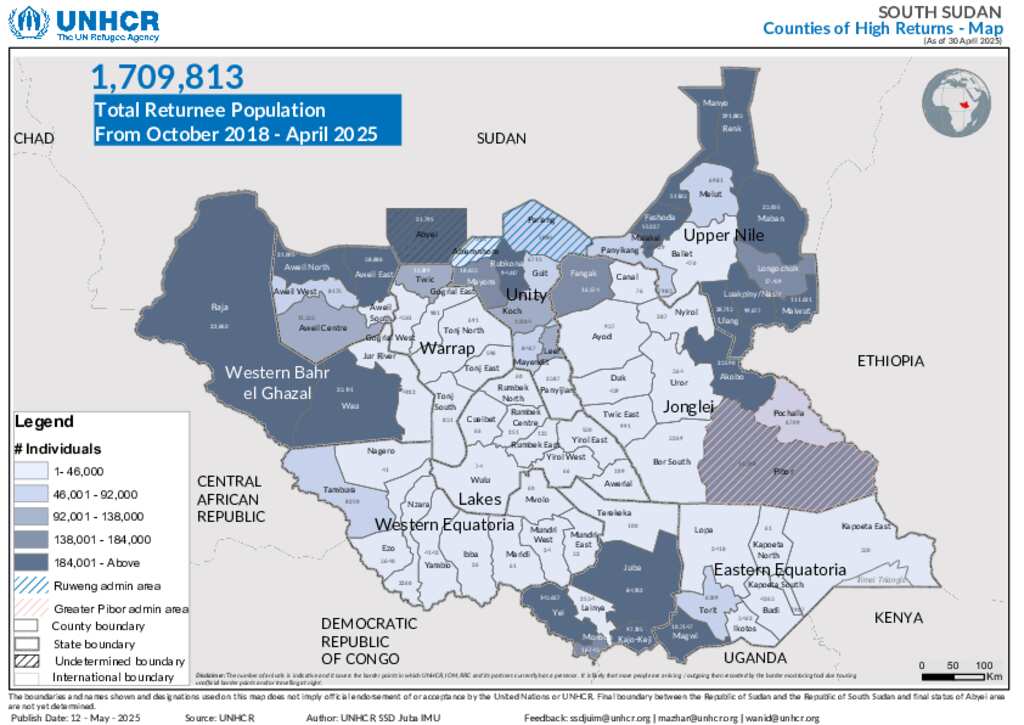 South Sudan Returnees_Counties Level_Heat Map -30 April 2025