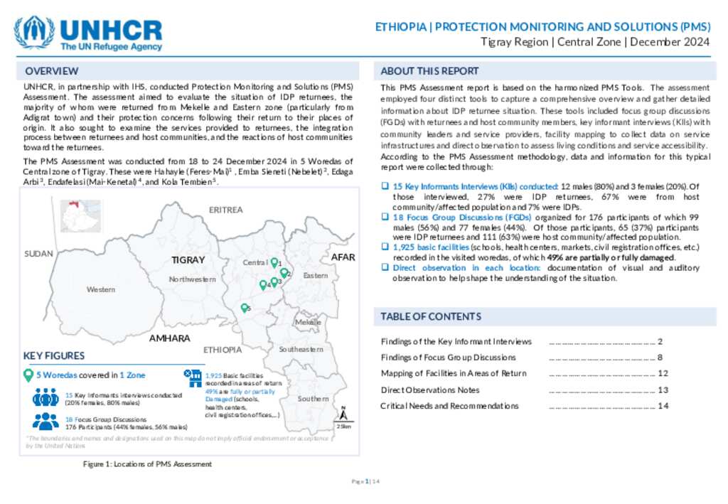 UNHCR, in partnership with IHS, conducted Protection Monitoring and Solutions (PMS) Assessment. The assessment aimed to evaluate the situation of IDP returnees, the majority of whom were returned from Mekelle and Eastern zone (particularly from Adigrat town) and their protection concerns following their return to their places of origin. It also sought to examine the services provided to returnees, the integration process between returnees and host communities, and the reactions of host communities toward the returnees.