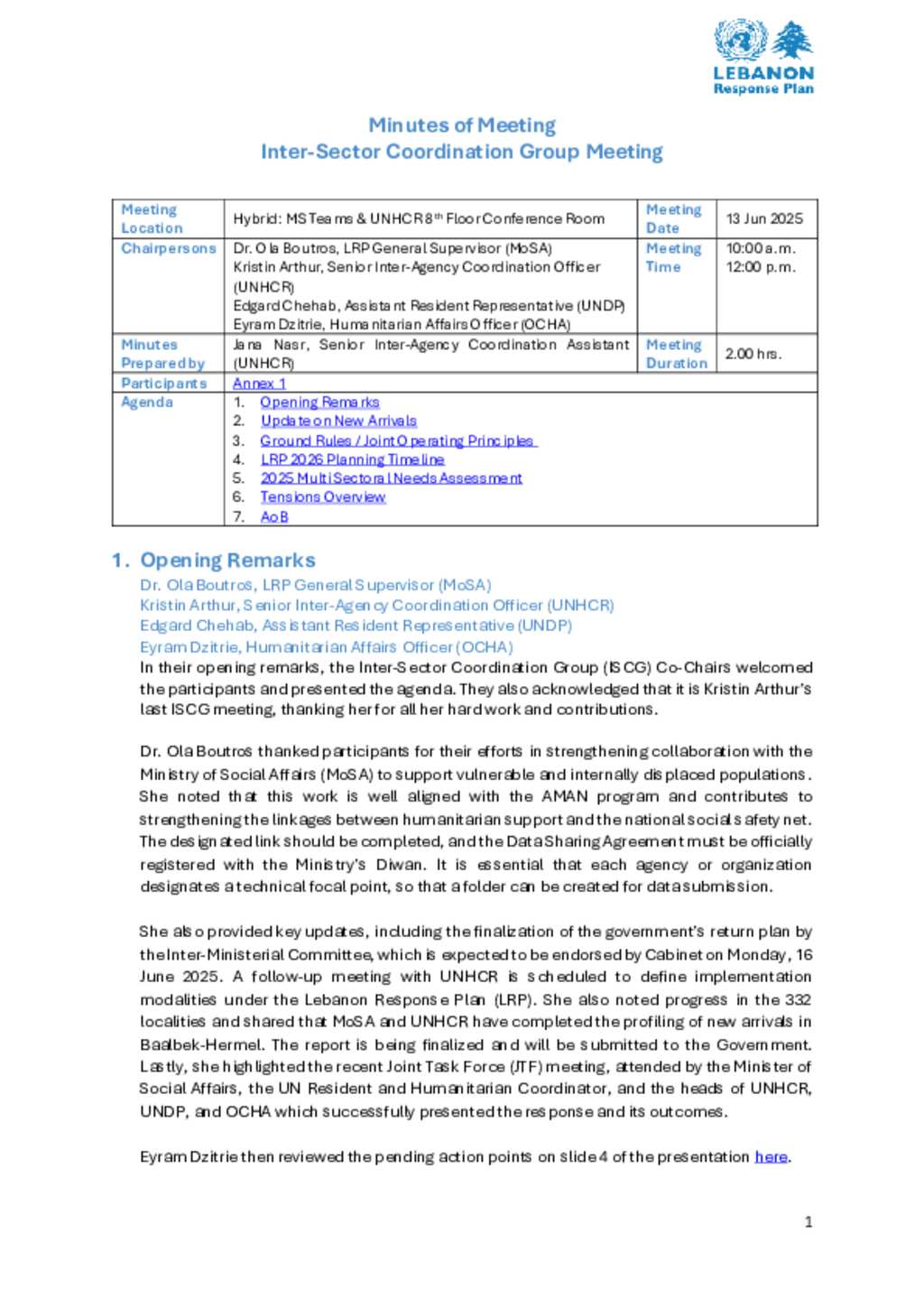 Lebanon: Inter-Sector Coordination Group Minutes of Meeting - 13 June 2025