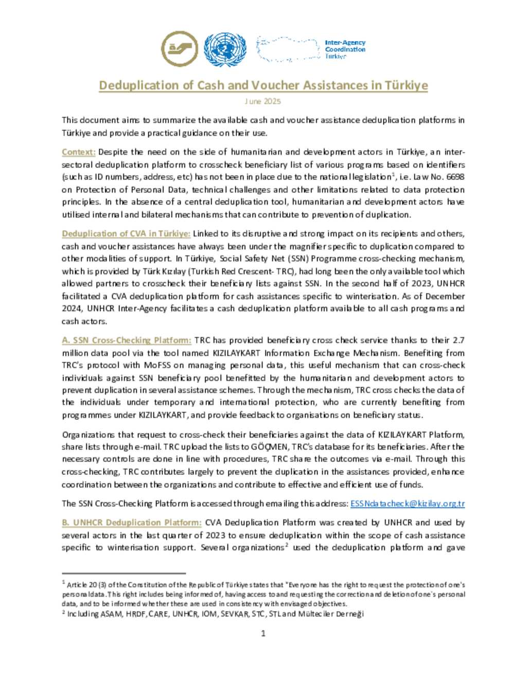 Türkiye: Deduplication of Cash and Voucher Assistances in Türkiye Guidance Note June 2025