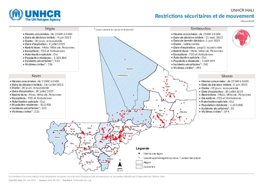 UNHCR Mali: Régions affectées par les restrictions sécuritaires et de mouvement au 30 juin 2025