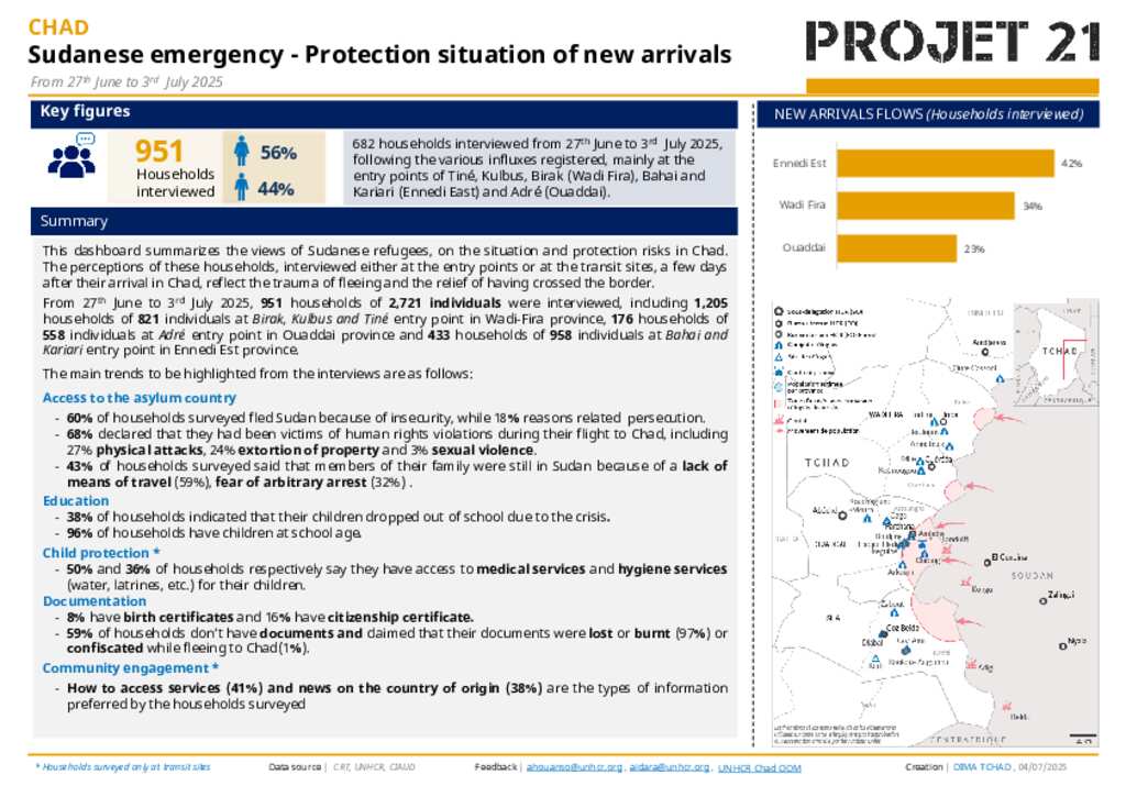 This dashboard summarizes the views of Sudanese refugees, on the situation and protection risks in Chad. The perceptions of these households, interviewed either at the entry points or at the transit sites, a few days after their arrival in Chad, reflect the trauma of fleeing and the relief of having crossed the border. From 27th June to 3rd July 2025, 951 households of 2,721 individuals were interviewed, including 1,205 households of 821 individuals at Birak, Kulbus and Tiné entry point in Wadi-Fira province, 176 households of 558 individuals at Adré entry point in Ouaddai province and 433 households of 958 individuals at Bahai and Kariari entry point in Ennedi Est province.