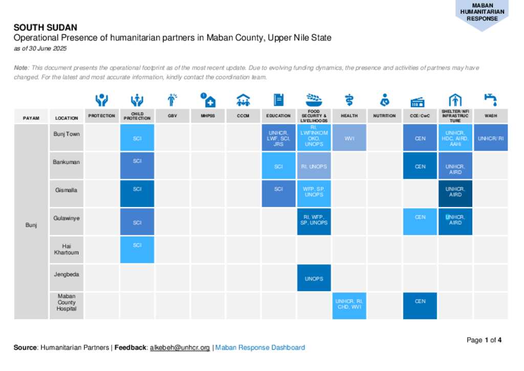 This document outlines the current operational presence of humanitarian partners in Maban County, Upper Nile State. Please note that partner activities and presence may shift due to changing funding and operational dynamics. For the most up-to-date and detailed information, kindly reach out to the coordination team.