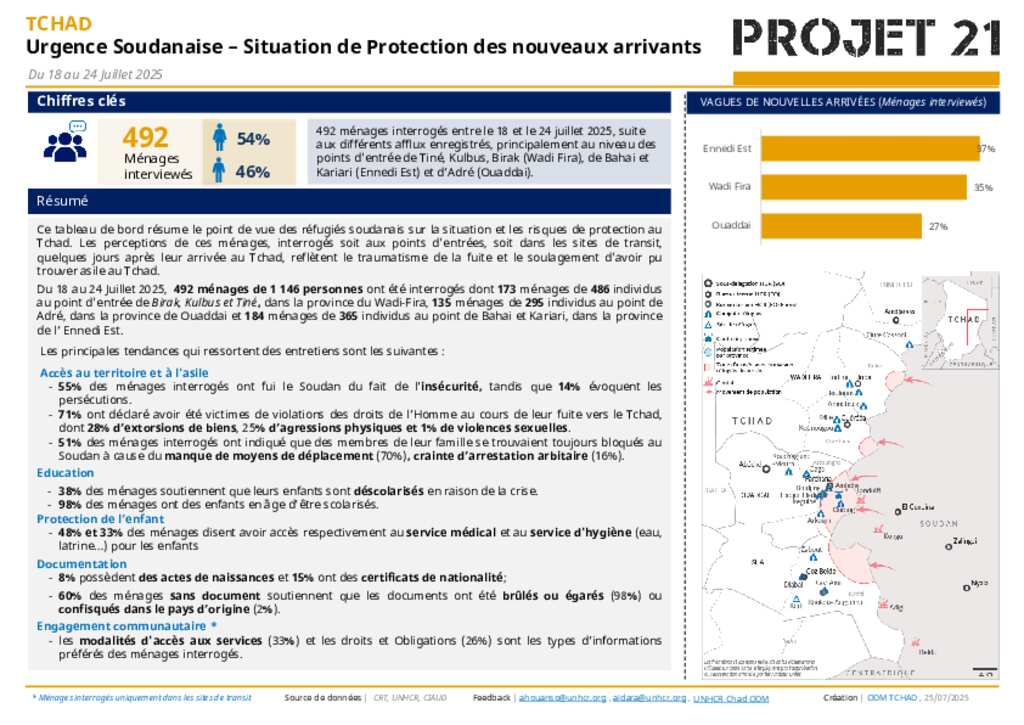 Ce tableau de bord résume le point de vue des réfugiés soudanais sur la situation et les risques de protection au Tchad. Les perceptions de ces ménages, interrogés soit aux points d'entrées, soit dans les sites de transit, quelques jours après leur arrivée au Tchad, reflètent le traumatisme de la fuite et le soulagement d'avoir pu trouver asile au Tchad. Du 21 au 27 avril 2025, 527 ménages de 1 616 personnes ont été interrogés dont 350 ménages 1 045 individus, aux points d'entrée de Birak, Kulbus et Tiné, dans la province du Wadi-Fira, 126 ménages de 420 individus au point au point d'entrée de Bahai, dans la province de Ennedi Est et 51 ménages de 151 personnes aux points d’entrée d’Adré, Midjiguilta, et Koufroun, dans la province du Ouaddai.