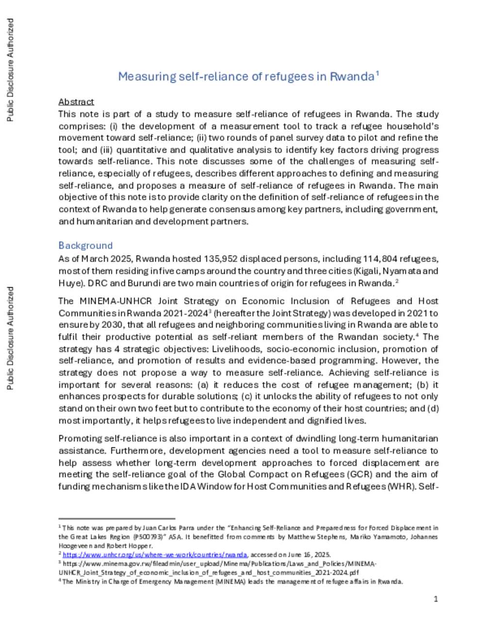 This note is part of a study to measure self-reliance of refugees in Rwanda. The study comprises: (i) the development of a measurement tool to track a refugee household’s movement toward self-reliance; (ii) two rounds of panel survey data to pilot and refine the tool; and (iii) quantitative and qualitative analysis to identify key factors driving progress towards self-reliance. This note discusses some of the challenges of measuring selfreliance, especially of refugees, describes different approaches to defining and measuring self-reliance, and proposes a measure of self-reliance of refugees in Rwanda. The main objective of this note is to provide clarity on the definition of self-reliance of refugees in the context of Rwanda to help generate consensus among key partners, including government, and humanitarian and development partners.