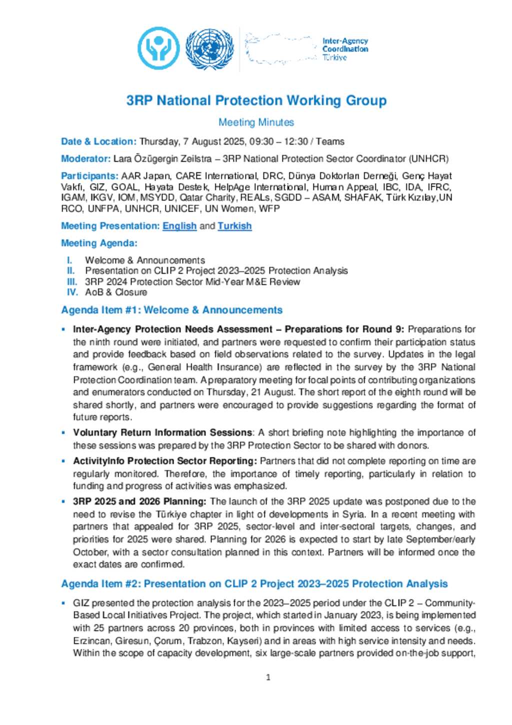 Türkiye: 3RP National Protection Working Group - Meeting Minutes (August 2025)