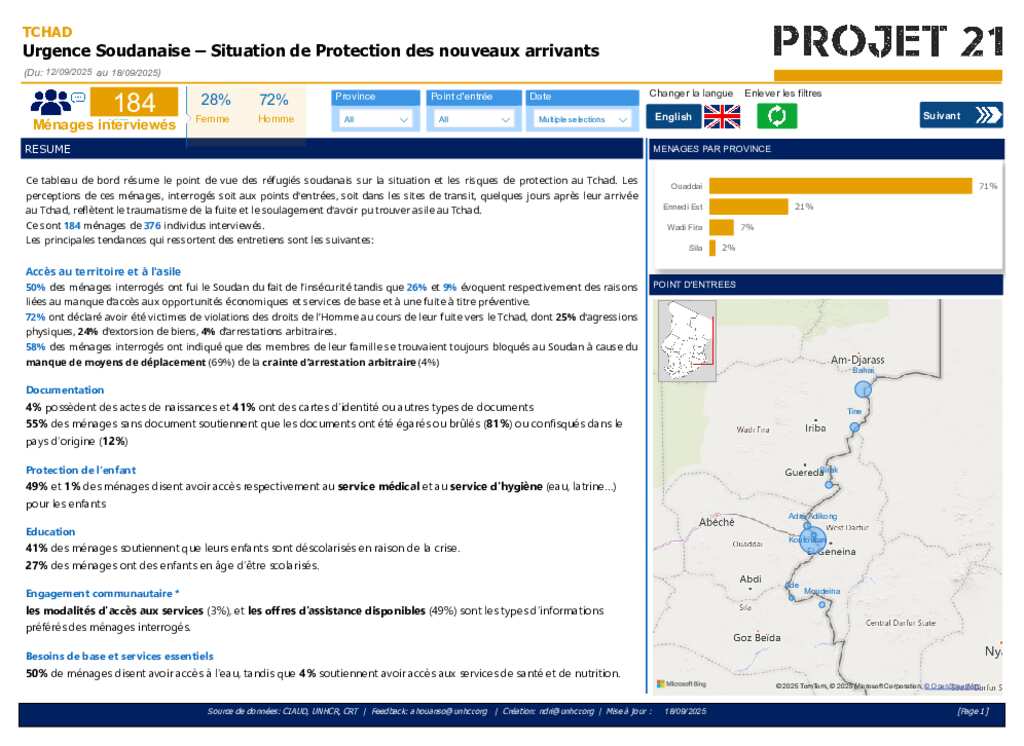Ce tableau de bord résume le point de vue des réfugiés soudanais sur la situation et les risques de protection au Tchad. Les perceptions de ces ménages, interrogés soit aux points d'entrées, soit dans les sites de transit, quelques jours après leur arrivée au Tchad, reflètent le traumatisme de la fuite et le soulagement d'avoir pu trouver asile au Tchad. Ce sont 184 ménages de 376 individus interviewés.