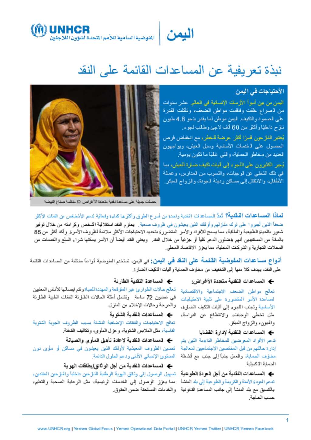 تستعرض هذه النشرة تدخلات المفوضية القائمة على النقد في اليمن لعام 2025، حيث تم دعم ما يقارب 547,000 فرد بمساعدات نقدية تجاوزت 26.3 مليون دولار أمريكي. تشمل التدخلات النقدية متعددة الأغراض، والدعم الطارئ، وتأهيل المأوى، والمساعدة القانونية، والعودة الطوعية. أظهرت التقييمات أن أكثر من ثلث النازحين لا يملكون أي دخل، وأن 62٪ من النازحين قللوا عدد وجباتهم اليومية للبقاء. وأظهرت المتابعة بعد التوزيع أن 100٪ من اللاجئين و99٪ من النازحين شهدوا تحسنًا في ظروفهم المعيشية.