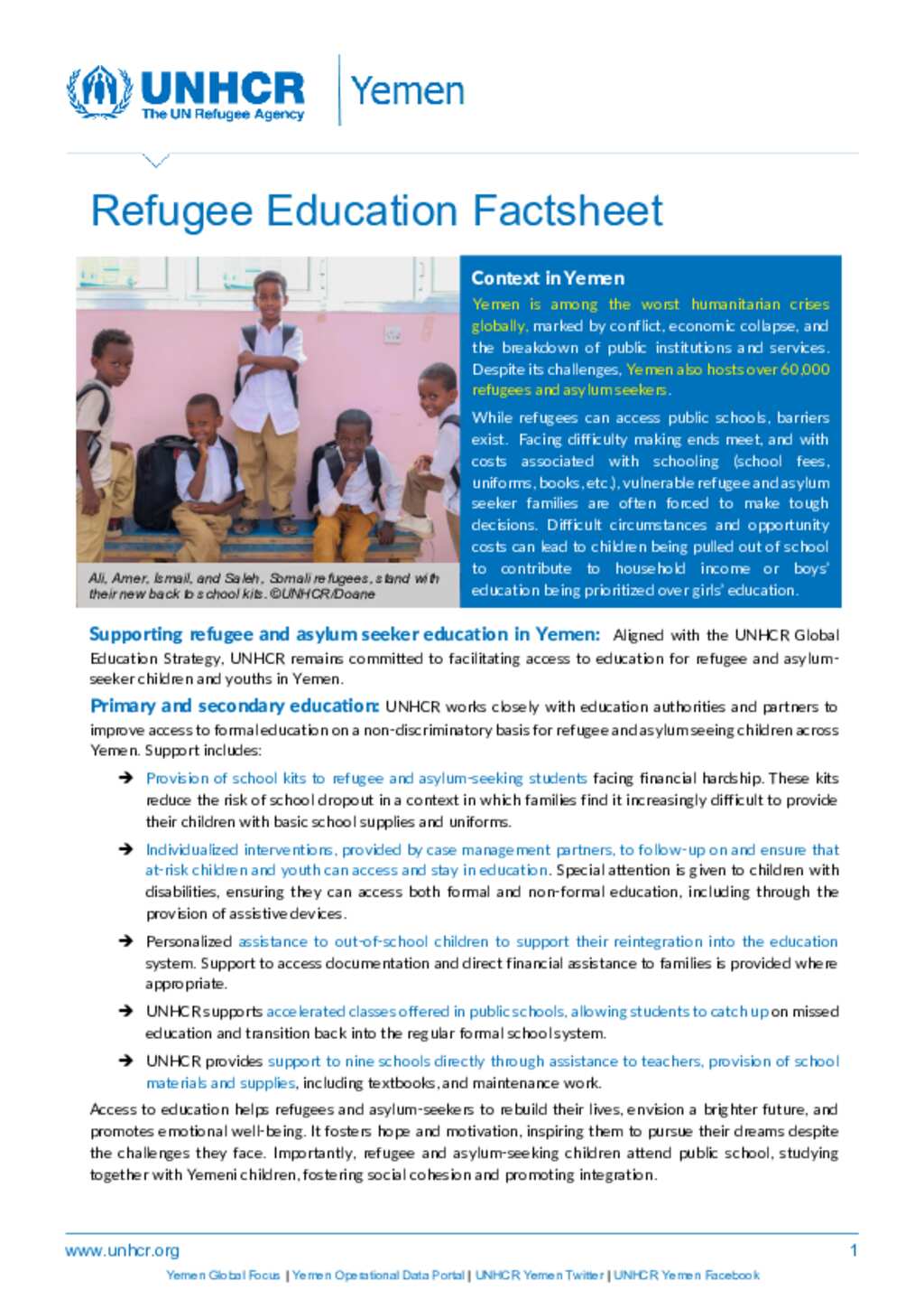 This factsheet highlights UNHCR Yemen’s efforts to support refugee and asylum seeker education in 2025. Over 8,300 children were enrolled in primary education, and 7,289 received material support. UNHCR also supported 432 children in secondary education, 129 in tertiary education, and 9 schools with materials and maintenance. In Kharaz camp, over 3,000 students accessed formal schooling.