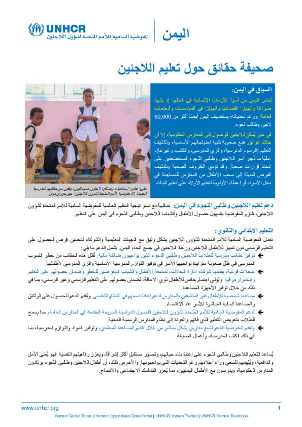 تسلط هذه النشرة الضوء على جهود المفوضية في دعم تعليم اللاجئين وطالبي اللجوء في اليمن لعام 2025. تم تسجيل أكثر من 8,300 طفل في التعليم الأساسي، وتلقى 7,289 طفلًا دعمًا ماديًا. كما دعمت المفوضية 432 طفلًا في التعليم الثانوي، و129 طالبًا في التعليم العالي، و9 مدارس بالمستلزمات والصيانة. وفي مخيم خرز، التحق أكثر من 3,000 طالب بالتعليم الرسمي.