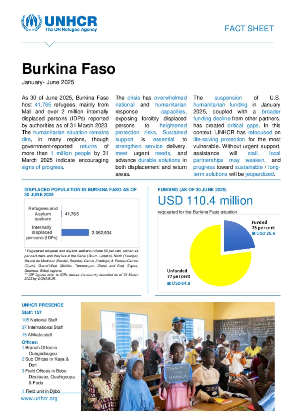 As 30 of June 2025, Burkina Faso host 41,765 refugees, mainly from Mali and over 2 million internally displaced persons (IDPs) reported by authorities as of 31 March 2023. The humanitarian situation remains dire, in many regions, though government-reported returns of more than 1 million people by 31 March 2025 indicate encouraging signs of progress.