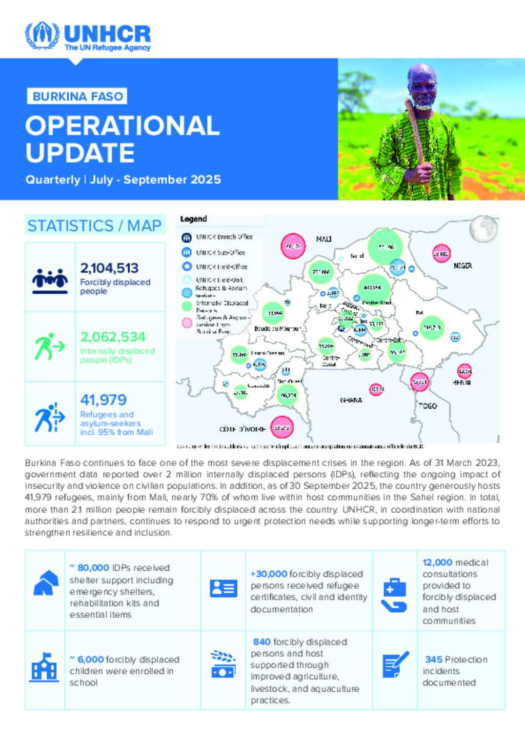 Burkina Faso continues to face one of the most severe displacement crises in the region. As of 31 March 2023, government data reported over 2 million internally displaced persons (IDPs), reflecting the ongoing impact of insecurity and violence on civilian populations. In addition, as of 30 September 2025, the country generously hosts 41,979 refugees, mainly from Mali, nearly 70% of whom live within host communities in the Sahel region. In total, more than 2.1 million people remain forcibly displaced across the country. UNHCR, in coordination with national authorities and partners, continues to respond to urgent protection needs while supporting longer-term efforts to strengthen resilience and inclusion.