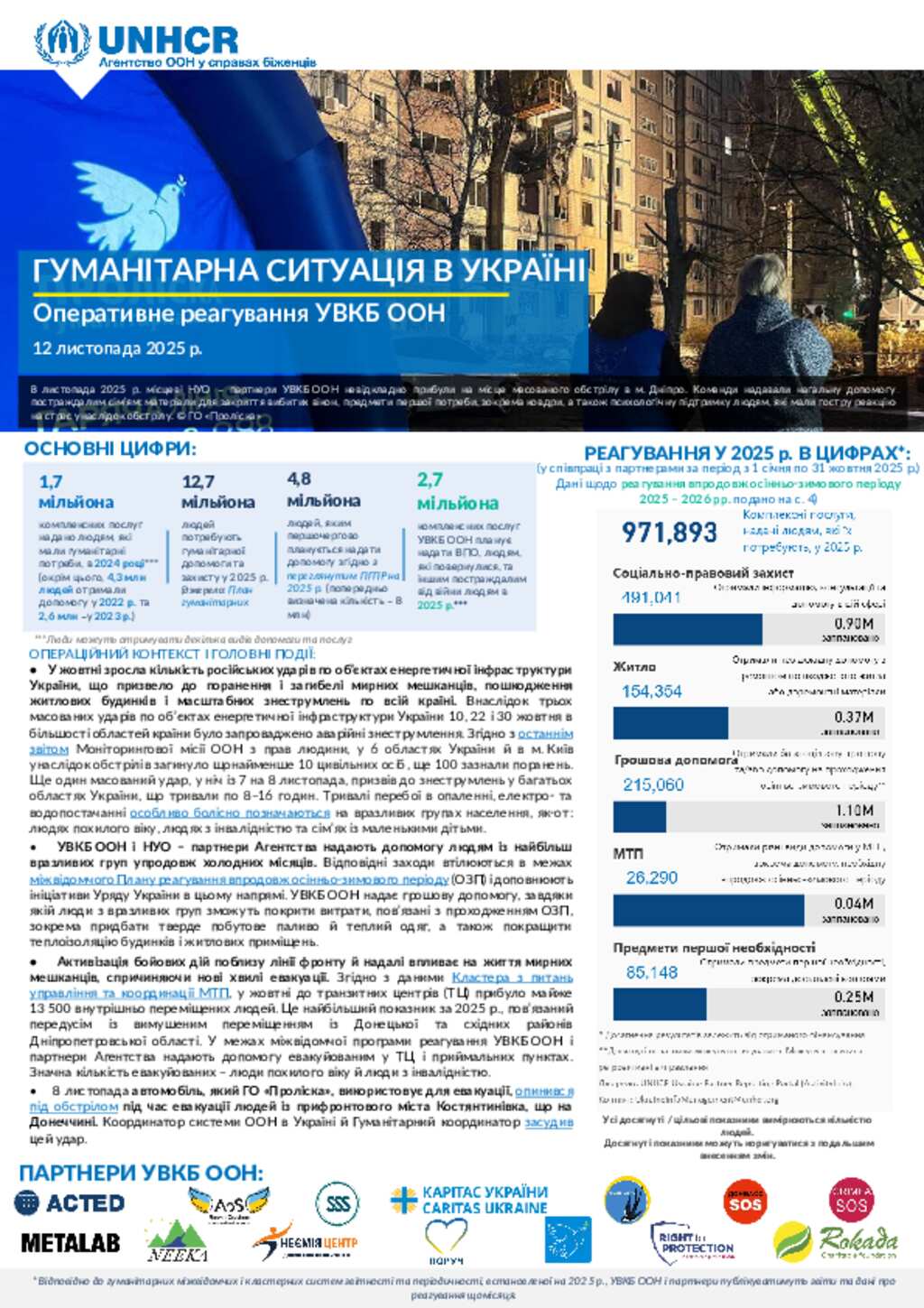 Гуманітарна ситуація в Україні: оновлення оперативного реагування УВКБ ООН. 12 листопада 2025 р.