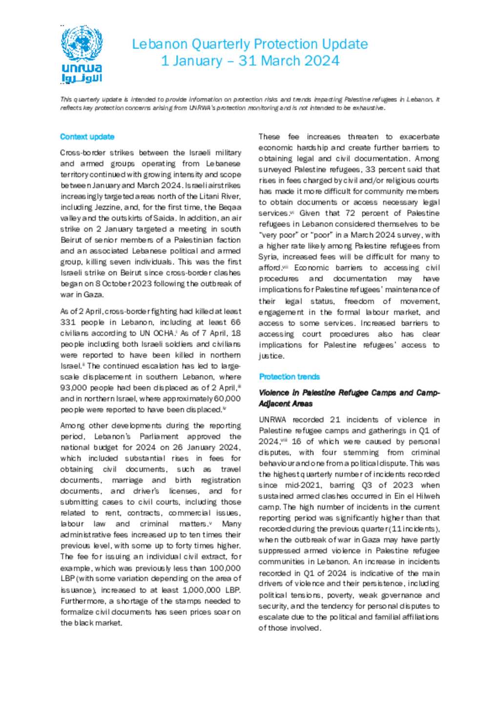 This quarterly update is intended to provide information on protection risks and trends impacting Palestine refugees in Lebanon. It reflects key protection concerns arising from UNRWA’s protection monitoring and is not intended to be exhaustive.