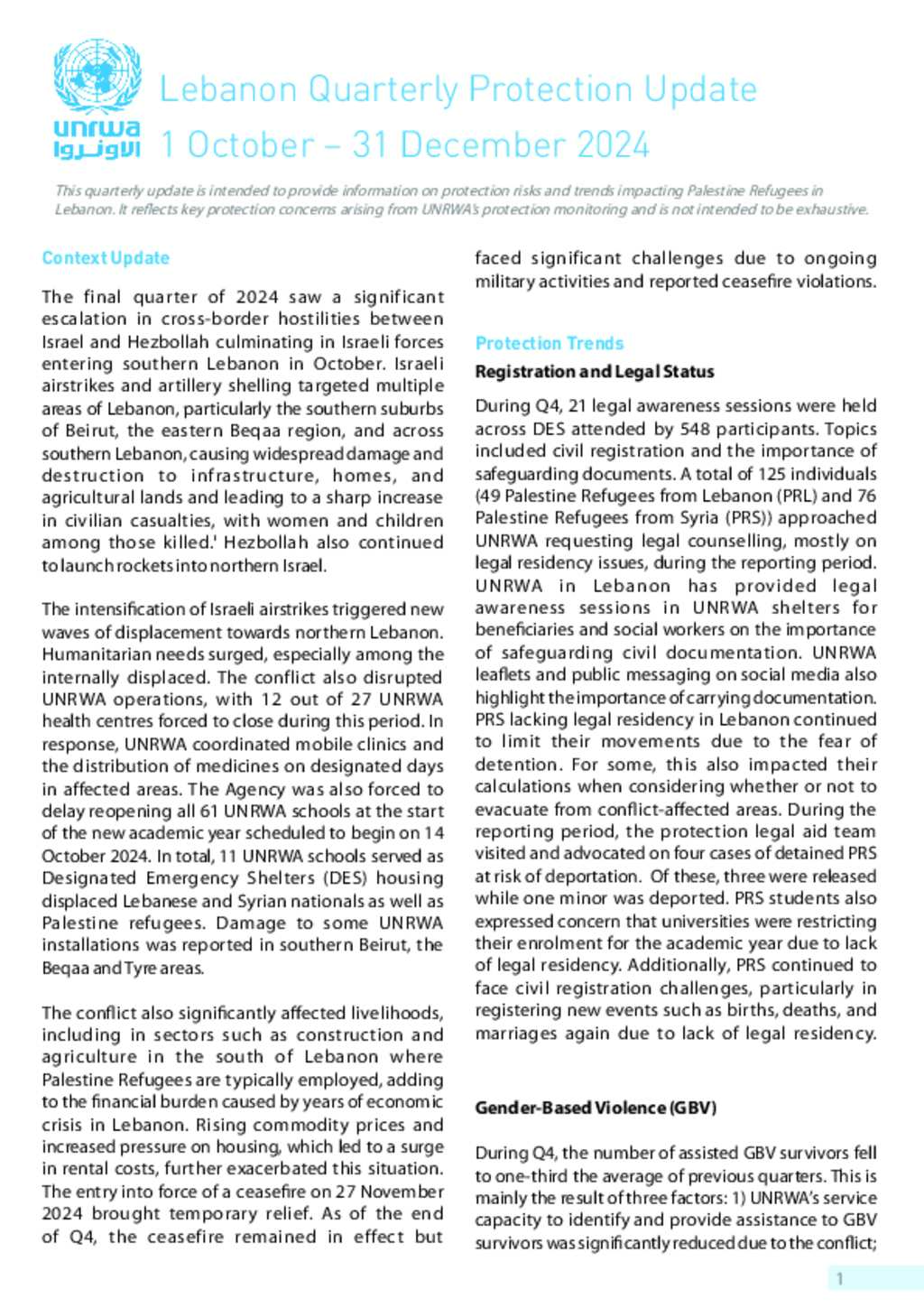 This quarterly update is intended to provide information on protection risks and trends impacting Palestine Refugees in Lebanon. It reflects key protection concerns arising from UNRWA’s protection monitoring and is not intended to be exhaustive.