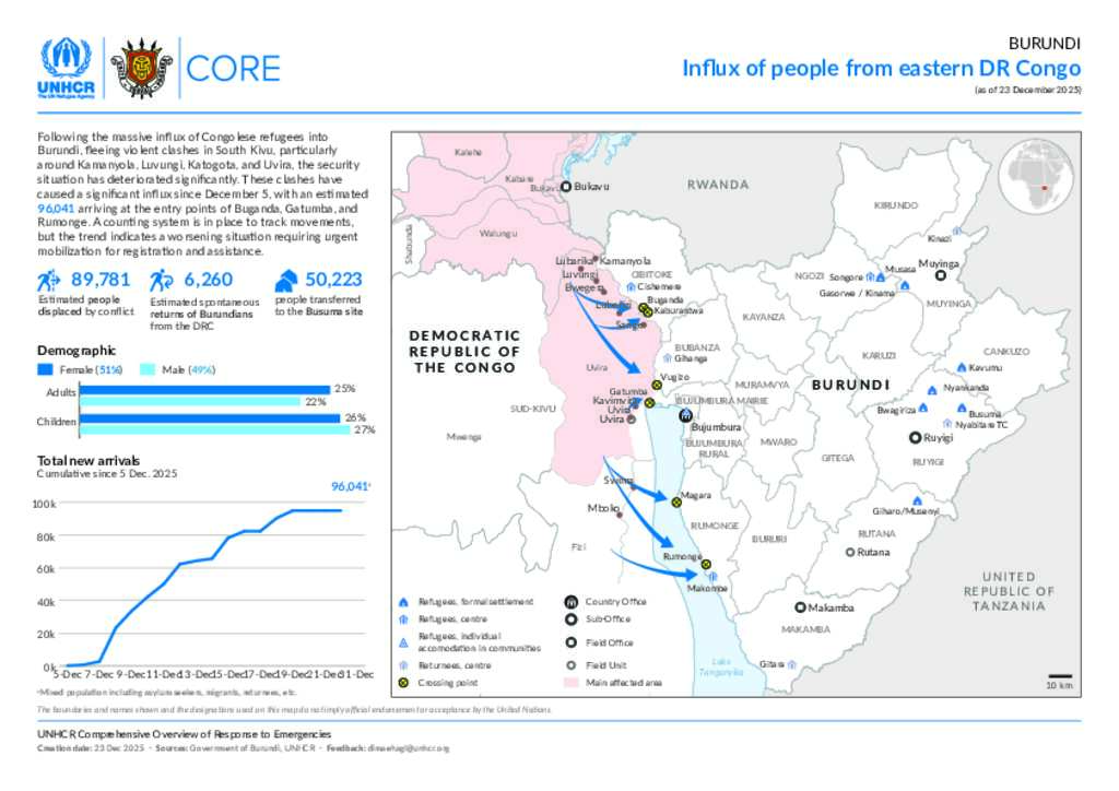 Following the mass arrival of Congolese refugees in Burundi, fleeing violent clashes in South Kivu, particularly around Kamanyola, Luvungi, Katogota and Uvira, the security situation has deteriorated significantly. These clashes have caused a significant influx since 5 December, with thousands of people entering Burundi at the entry points of Buganda, Gatumba and Rumonge. A counting system is in place to track movements, but the trend indicates a worsening situation requiring urgent mobilisation for registration and assistance. Translated with DeepL.com (free version)