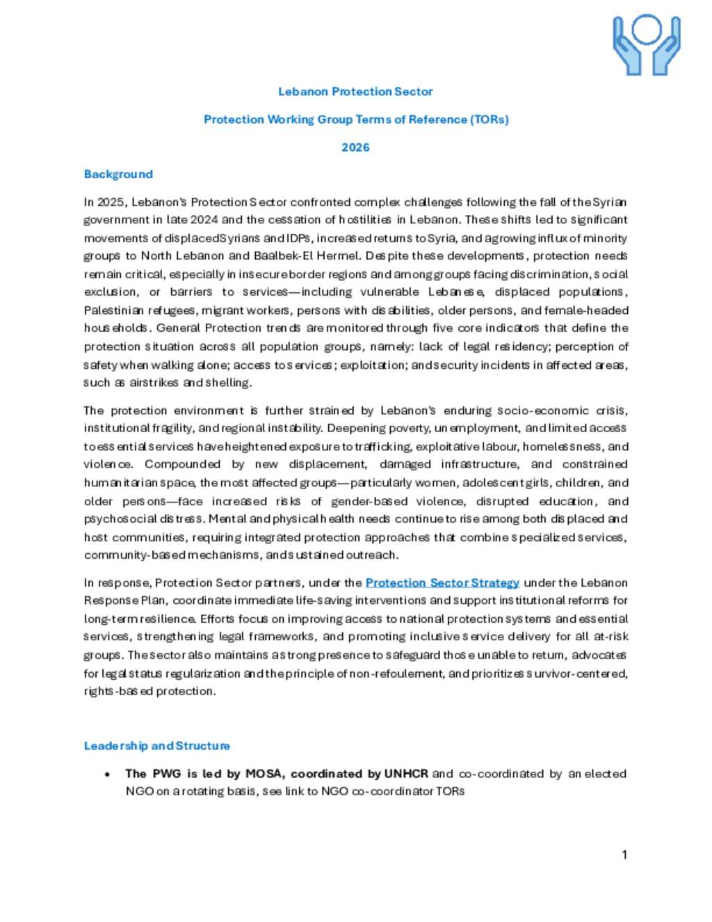 Lebanon: Protection Working Group Terms of Reference (TORs) - 2026