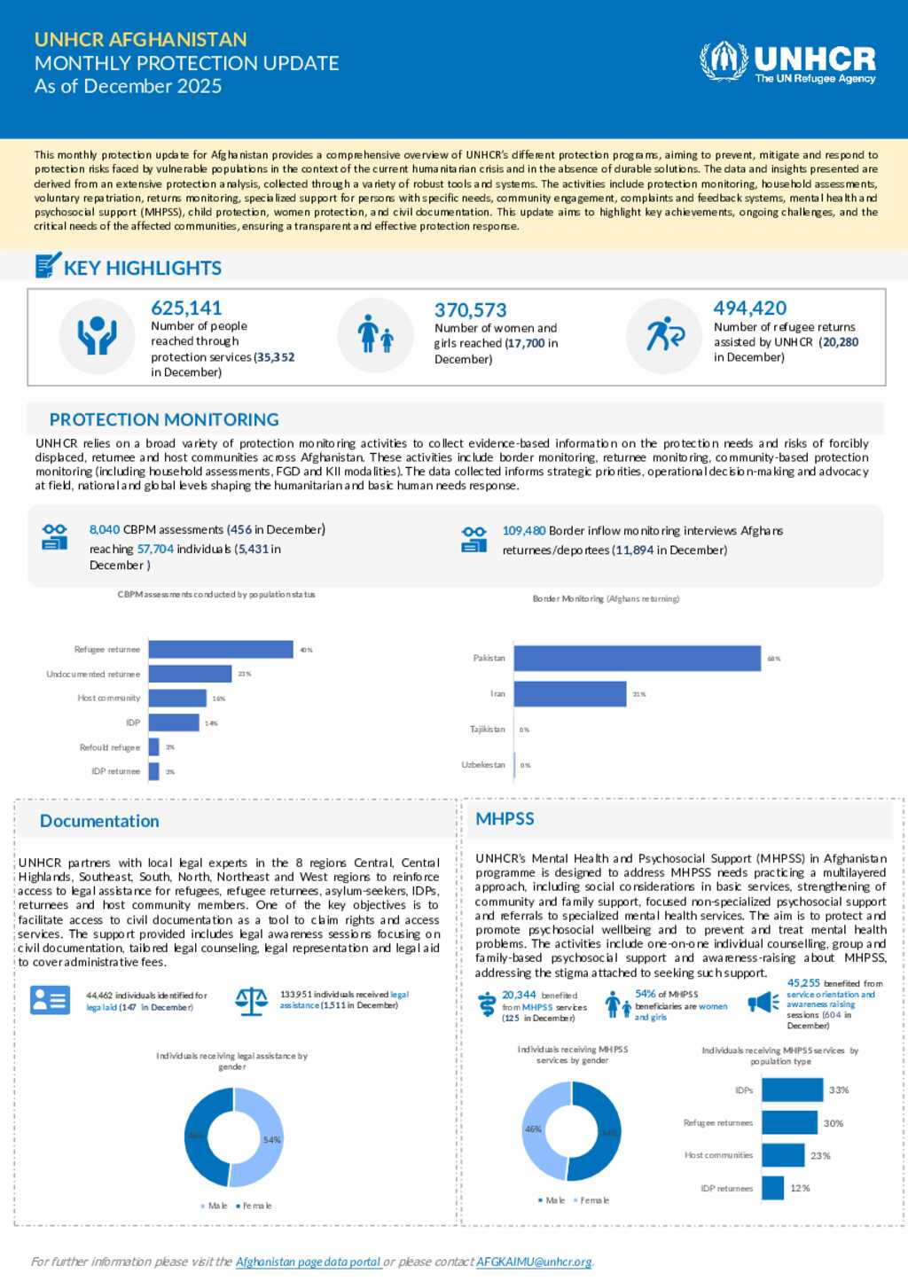 This monthly protection update for Afghanistan provides a comprehensive overview of UNHCR’s different protection programs, aiming to prevent, mitigate and respond to protection risks faced by vulnerable populations in the context of the current humanitarian crisis and in the absence of durable solutions. The data and insights presented are derived from an extensive protection analysis, collected through a variety of robust tools and systems. The activities include protection monitoring, household assessments, voluntary repatriation, returns monitoring, specialized support for persons with specific needs, community engagement, complaints and feedback systems, mental health and psychosocial support (MHPSS), child protection, women protection, and civil documentation. This update aims to highlight key achievements, ongoing challenges, and the critical needs of the affected communities, ensuring a transparent and effective protection response.