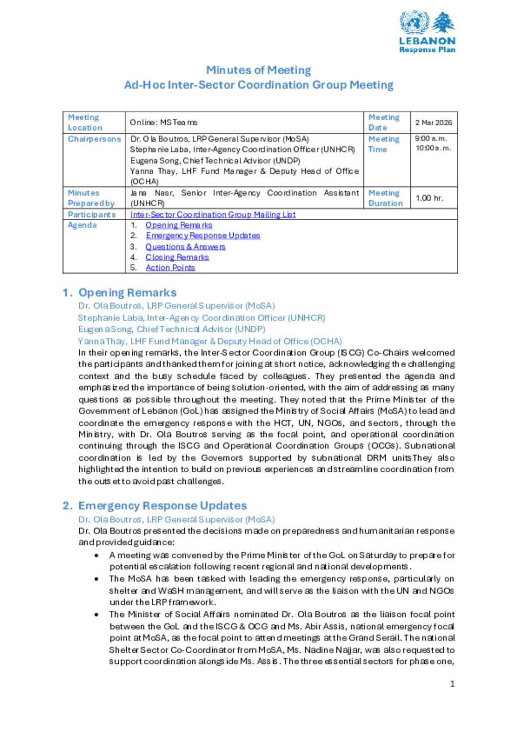 Lebanon: Ad-Hoc Inter-Sector Coordination Group Minutes of Meeting - 2 March 2026