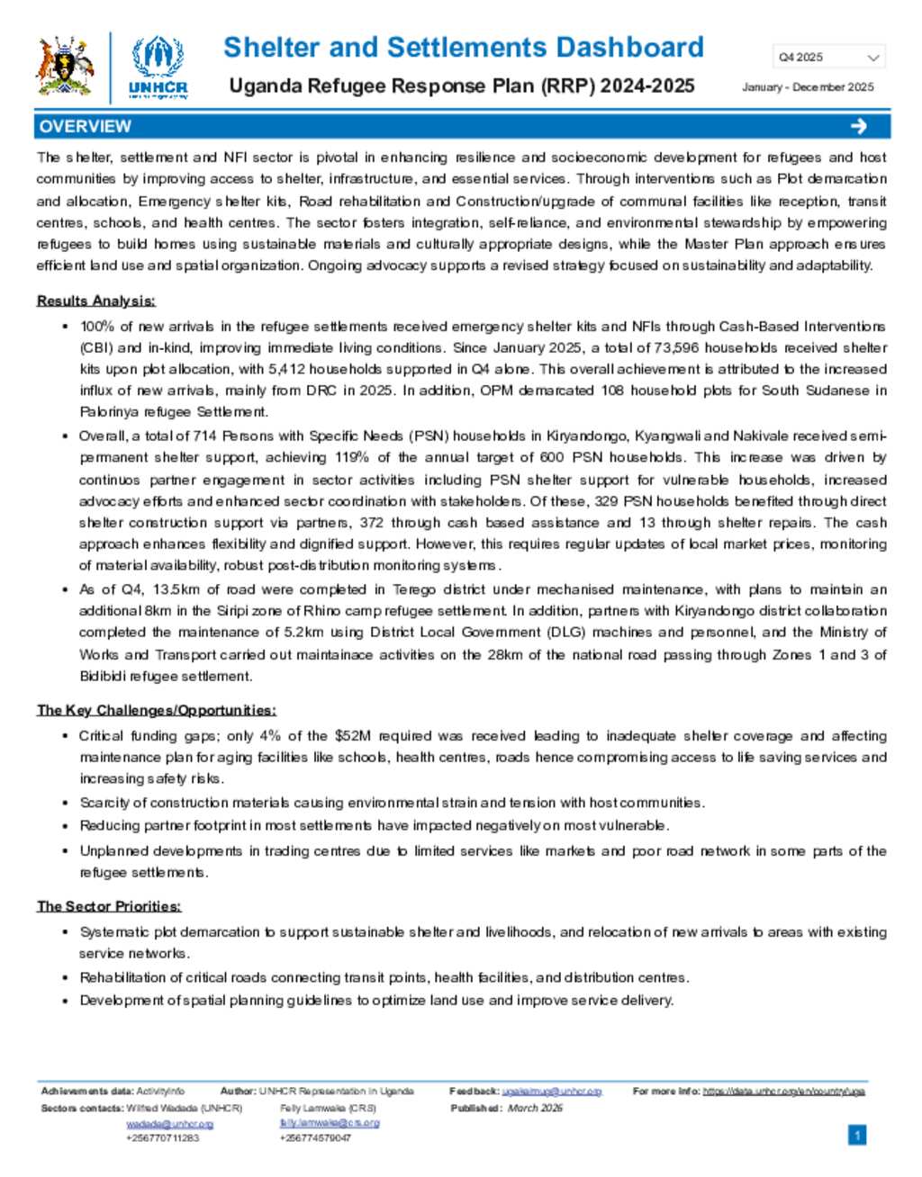 Uganda Refugee Response: Shelter, Settlement and NFI dashboard Quarter 4 2025