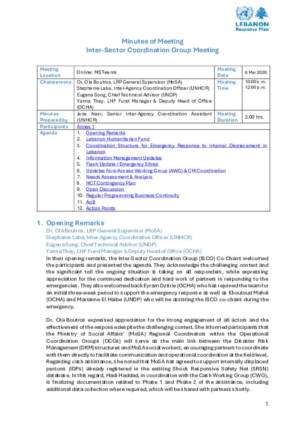 Lebanon: Inter-Sector Coordination Group Minutes of Meeting - 6 March 2026