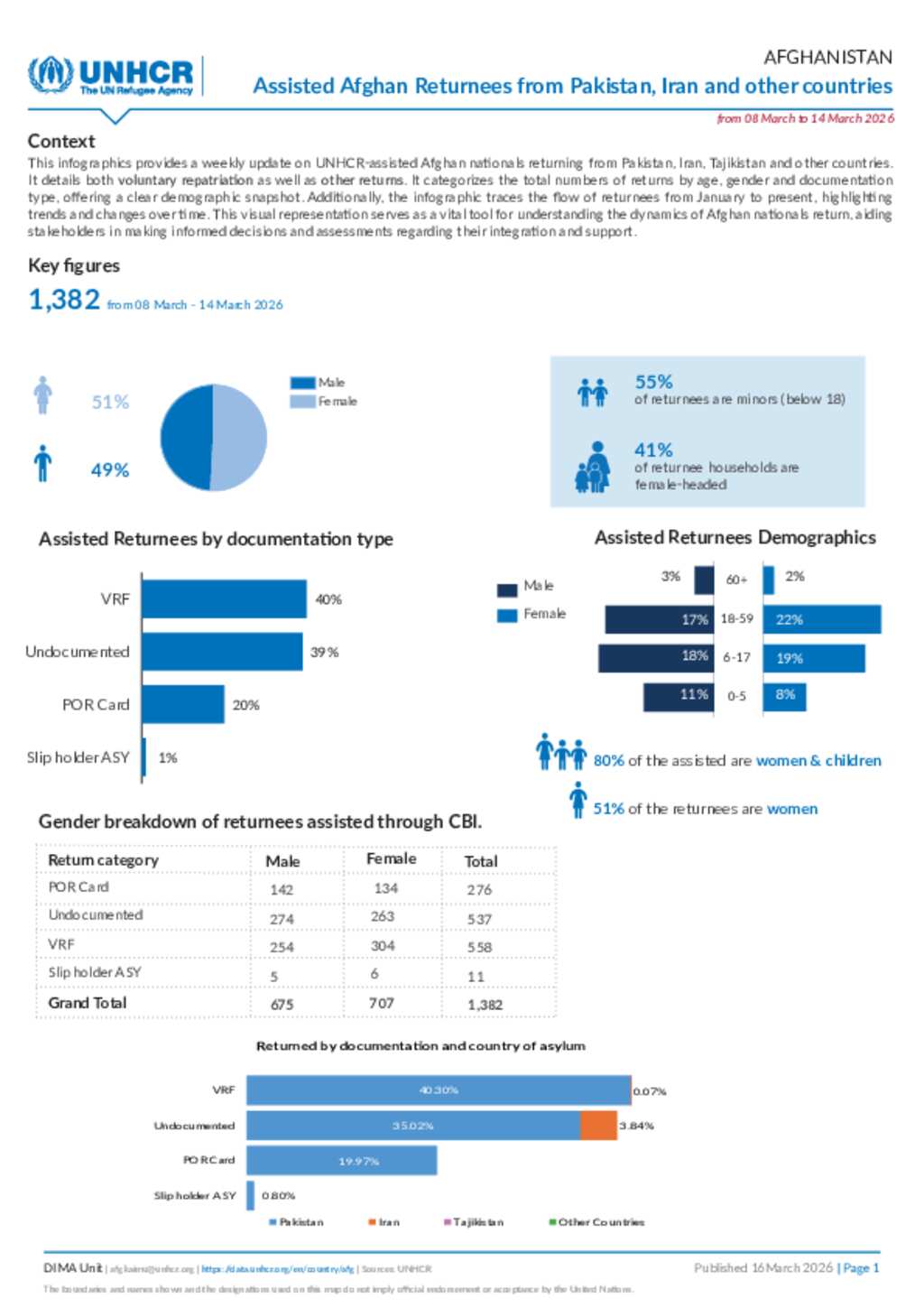 This dashboard provides a weekly update on UNHCR-assisted Afghan nationals returning from Pakistan. It details both voluntary repatriation as well as forced returns. It categorizes the total numbers of returns by age, gender and documentation type, offering a clear demographic snapshot. Additionally, the infographic traces the flow of returnees from January to present, highlighting trends and changes over time. This visual representation serves as a vital tool for understanding the dynamics of Afghan nationals return, aiding stakeholders in making informed decisions and assessments regarding their integration and support.