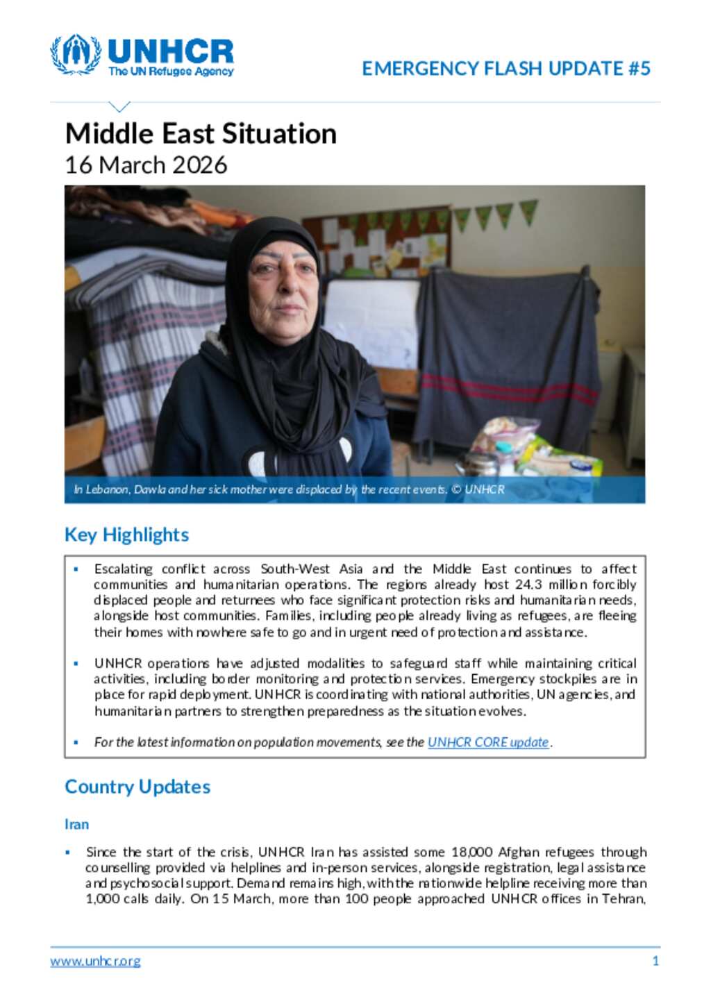 UNHCR Middle East Situation: Emergency Flash Update #5 - as of 16 March 2026