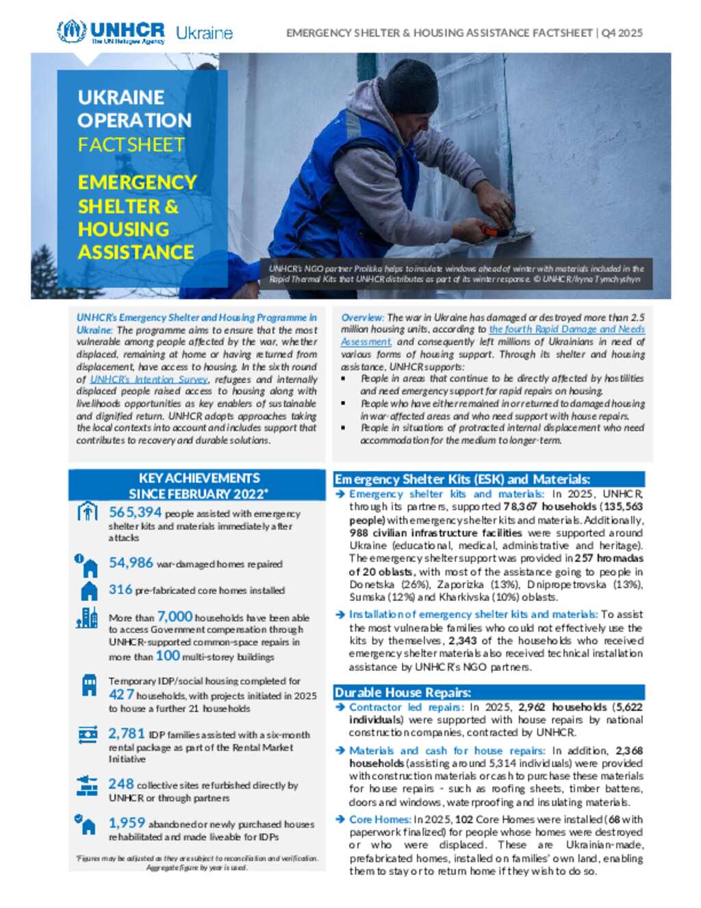 UNHCR Ukraine: Emergency Shelter and Housing Factsheet - Q4 2025