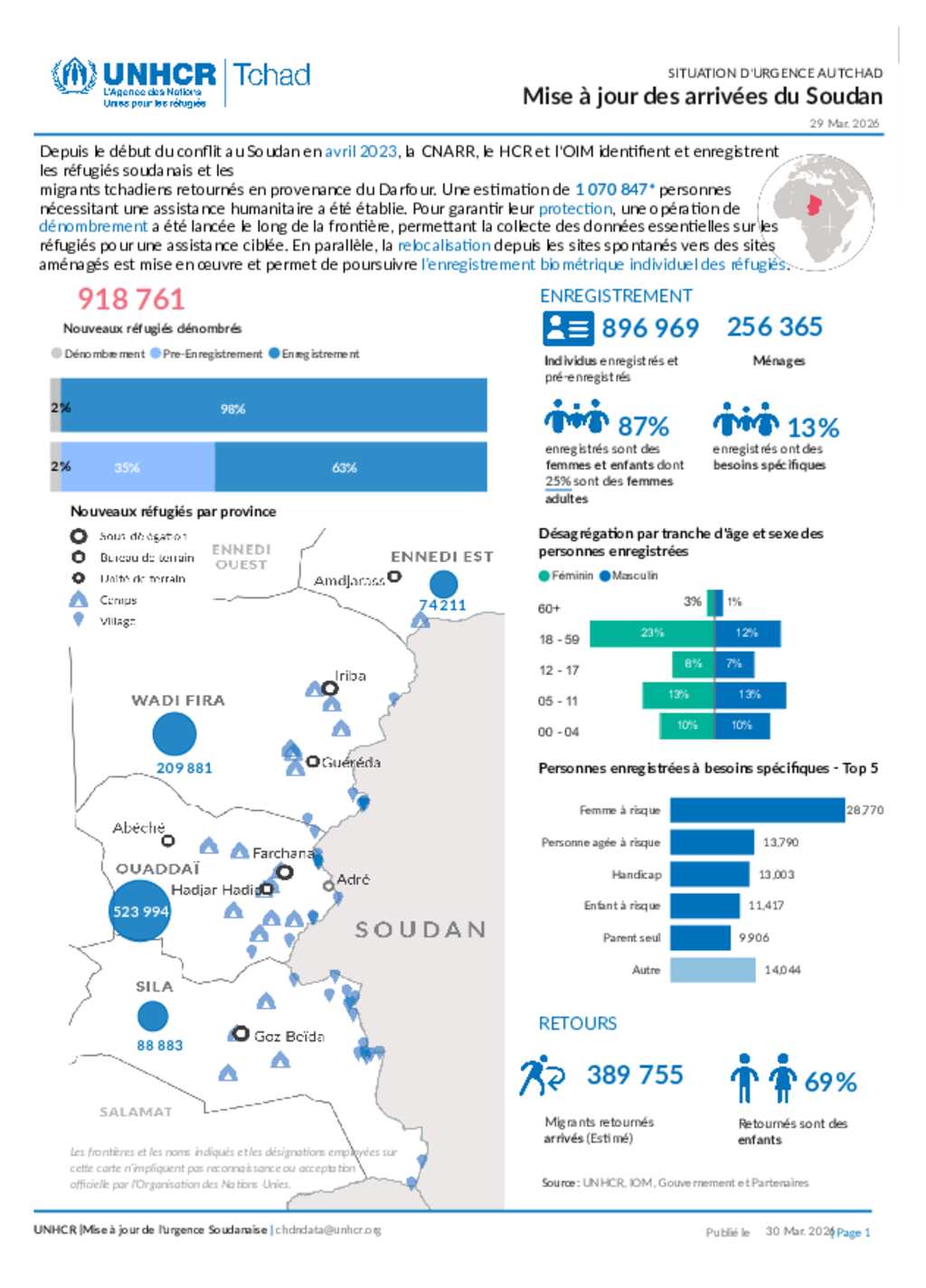 UNHCR TCHAD| Afflux des Réfugiés du Soudan | Statistiques de l'enregistrement individuel biométrique (au 30 mars 2026)