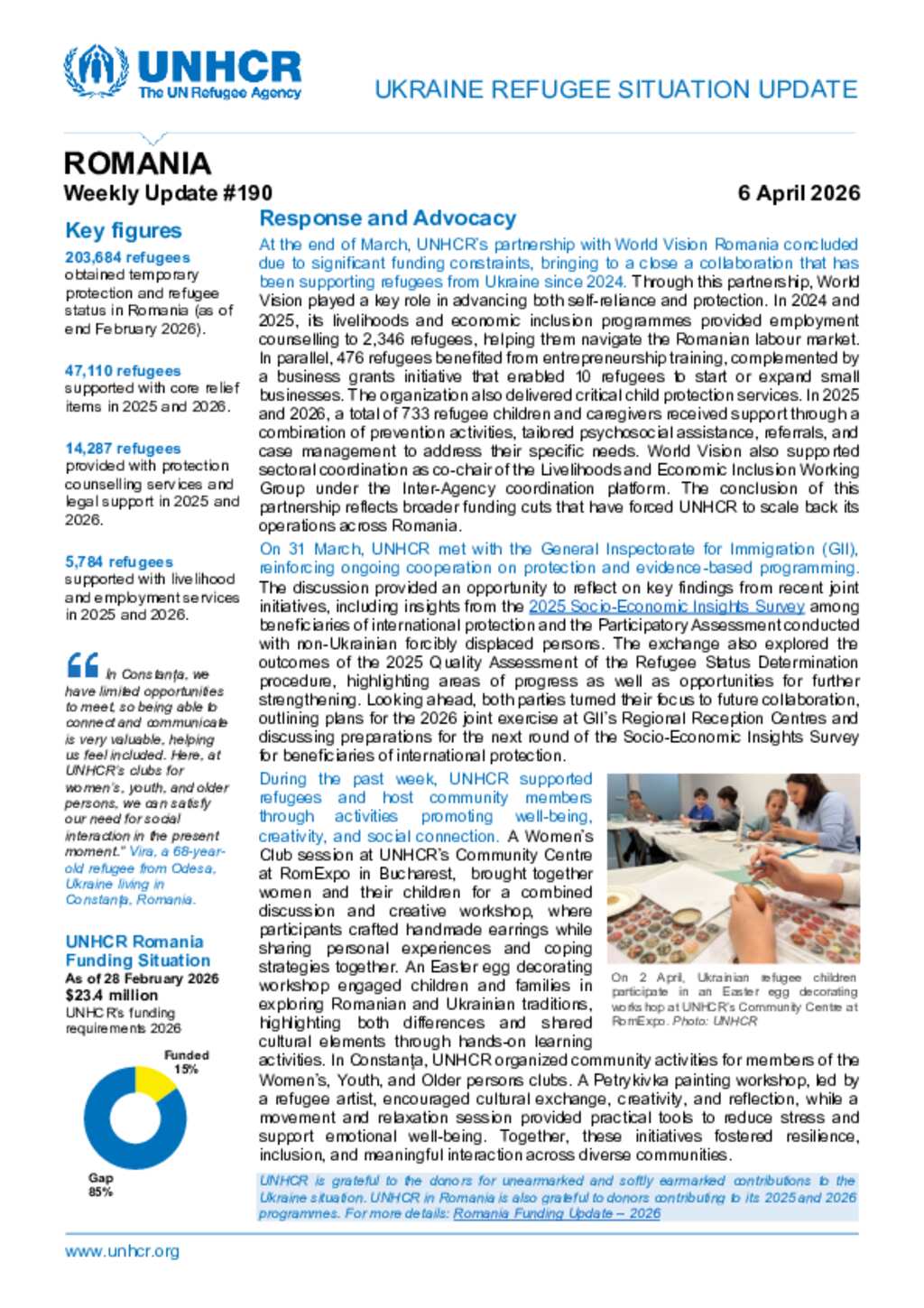 UNHCR Romania Ukraine Refugee Situation Update - 6 April 2026