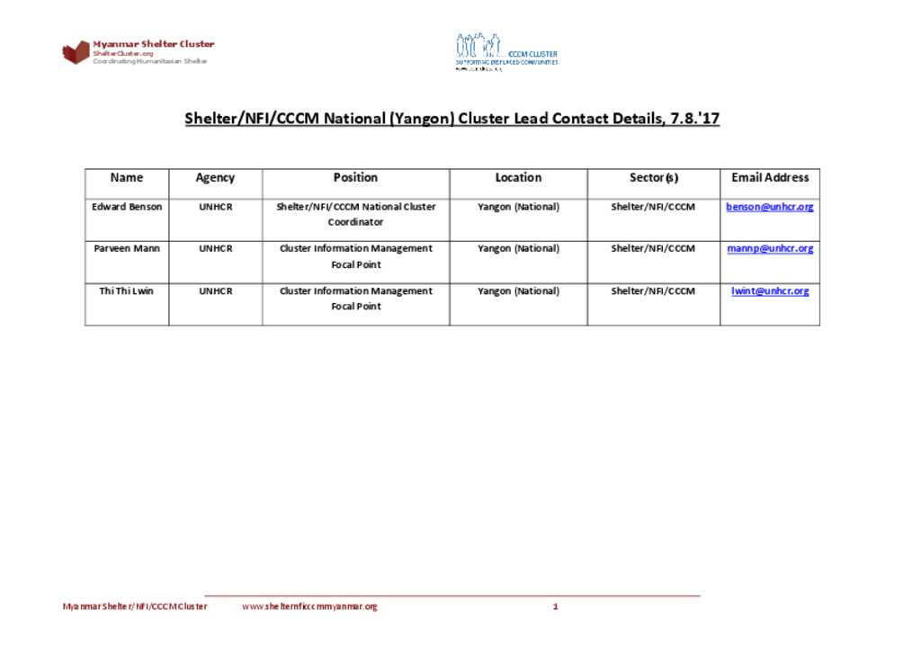 Shelter-NFI-CCCM Cluster Leads National (Yangon) Cluster Members Contact Details, 7.8.'17