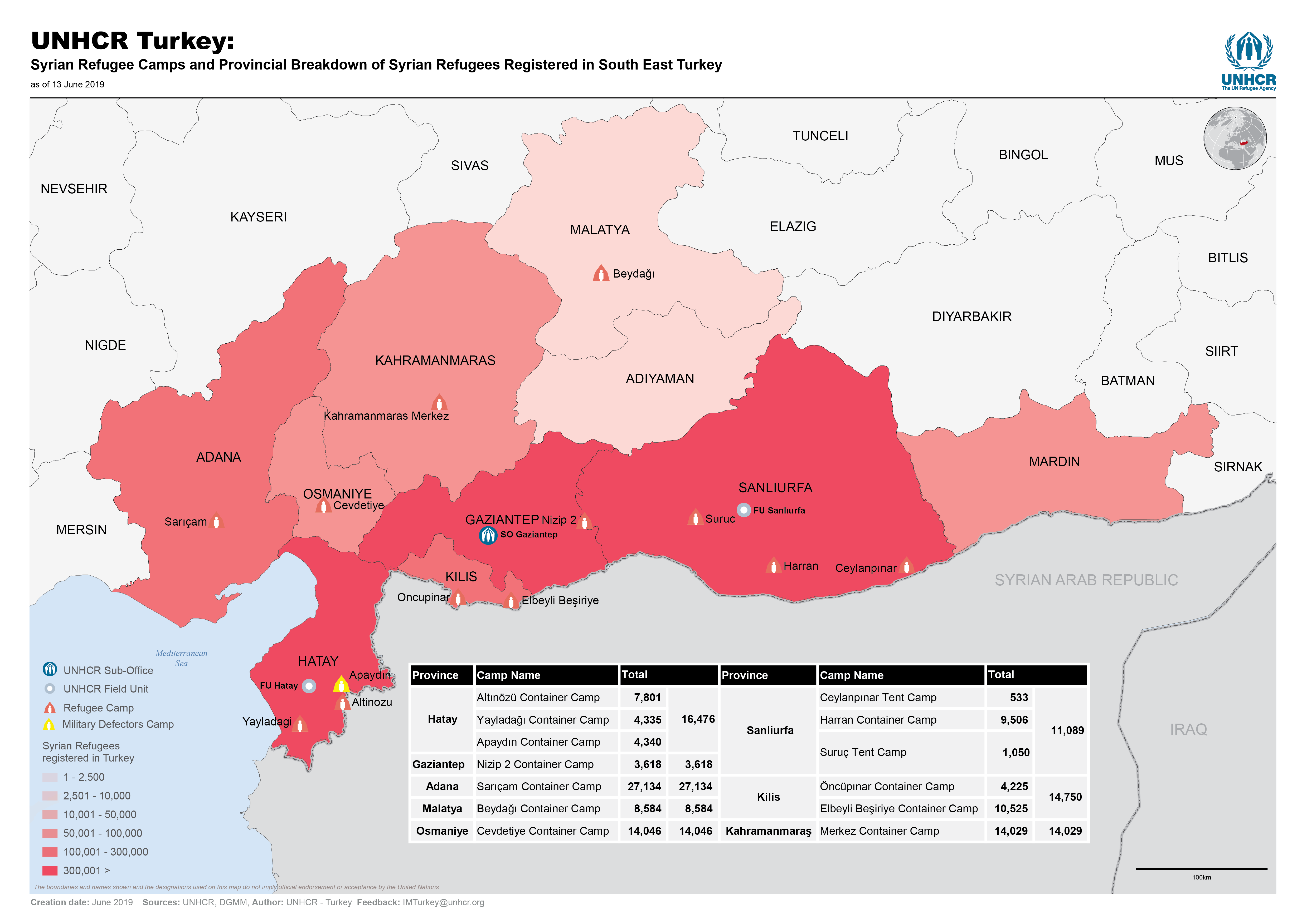 UNHCR Turkey: Syrian Refugee Camps and Provincial Breakdown of Syrian Refugees Registered in South East Turkey - June 2019