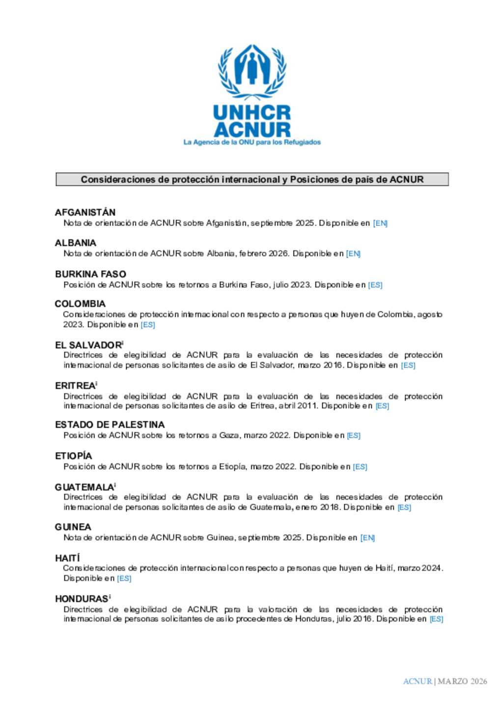 Posiciones ACNUR sobre Protección Internacional marzo de 2026