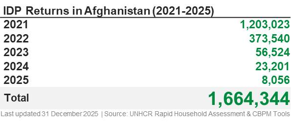 The above Returned IDPs data is from household-level rapid assessments conducted across the country by UNHCR and its partners. These figures are expected to increase retroactively with ongoing assessments, and considered indicative rather than overall statistical data of IDP returnees in Afghanistan. It is also important to note that figures may be underestimated due to recent downscaling of assessments undertaken in 2023.