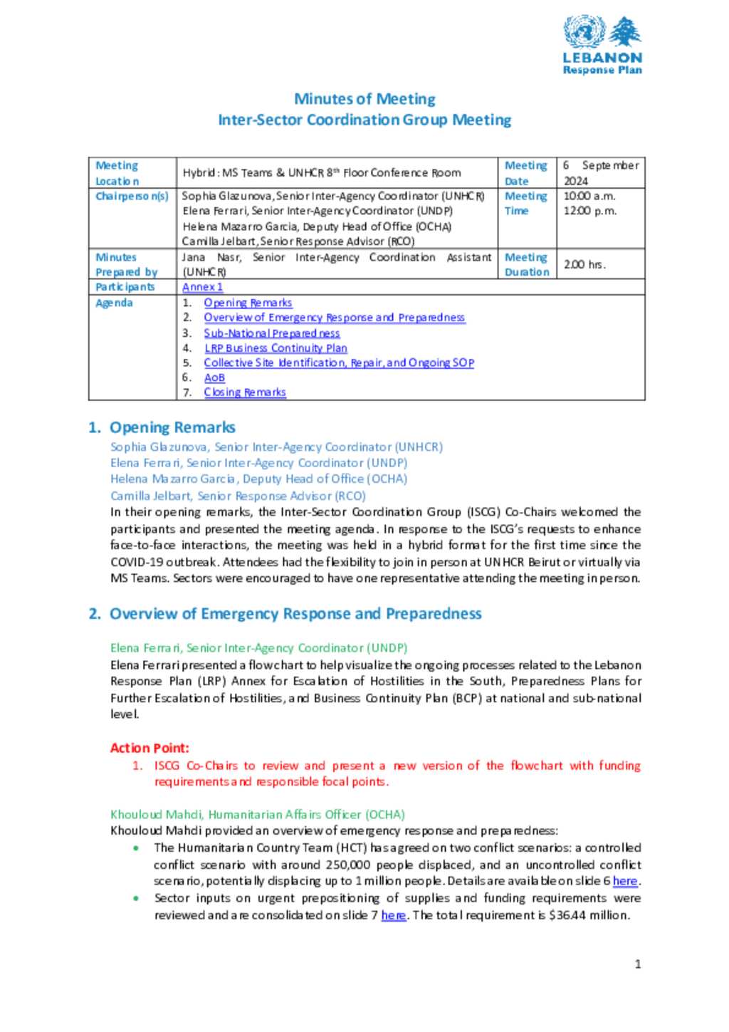 Lebanon: Inter-Sector Coordination Group Minutes of Meeting - 6 September 2024