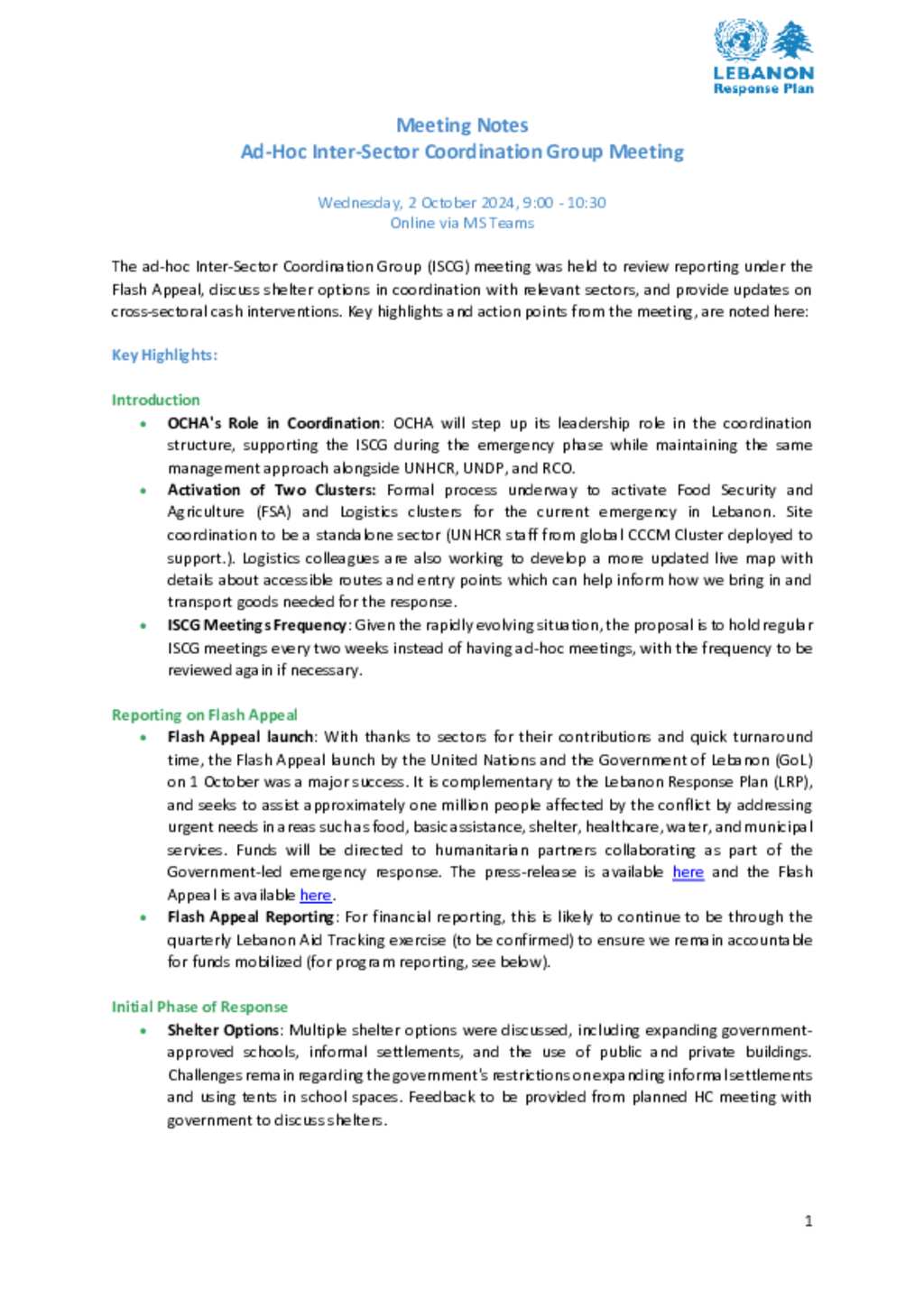 Lebanon: A-Hoc Inter-Sector Coordination Group Meeting Notes - 2 October 2024