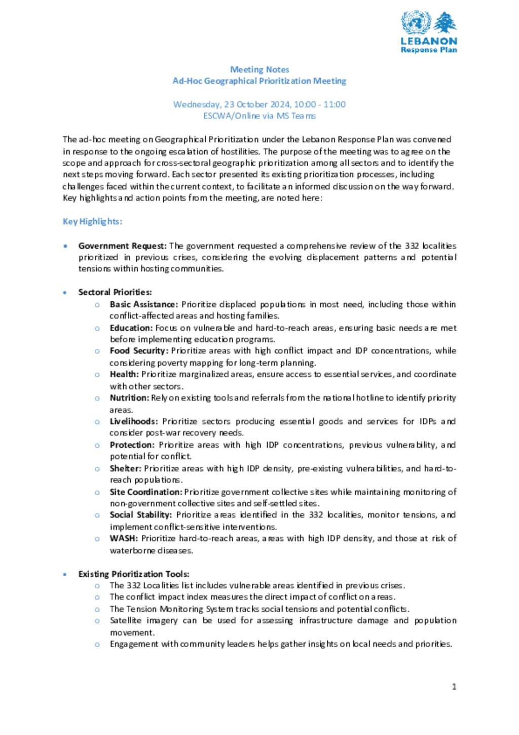 Lebanon: Ad-Hoc Geographical Prioritization Meeting Notes - 23 October 2024