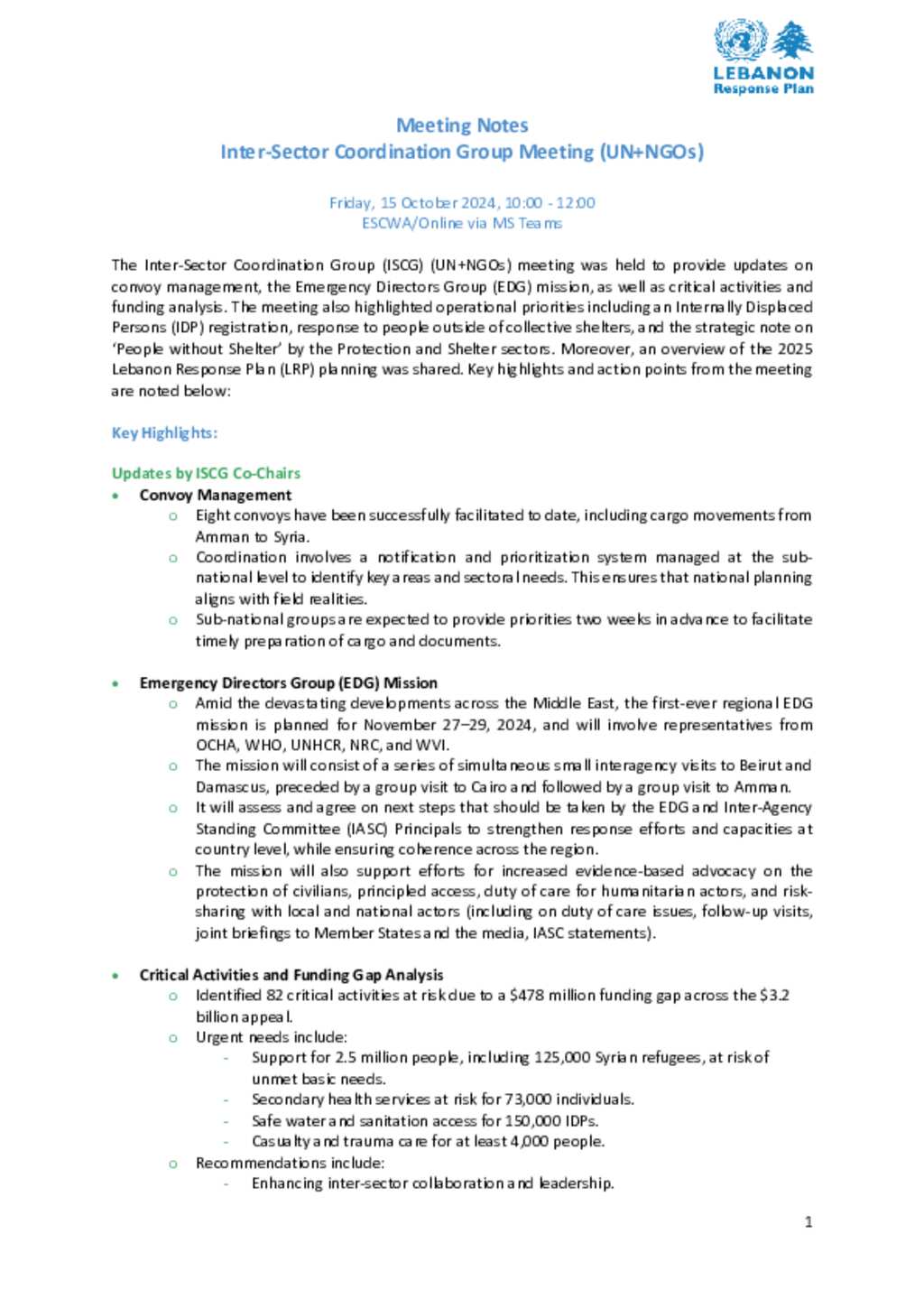 Lebanon: Inter-Sector Coordination Group Meeting Notes (UN+NGOs) - 15 November 2024