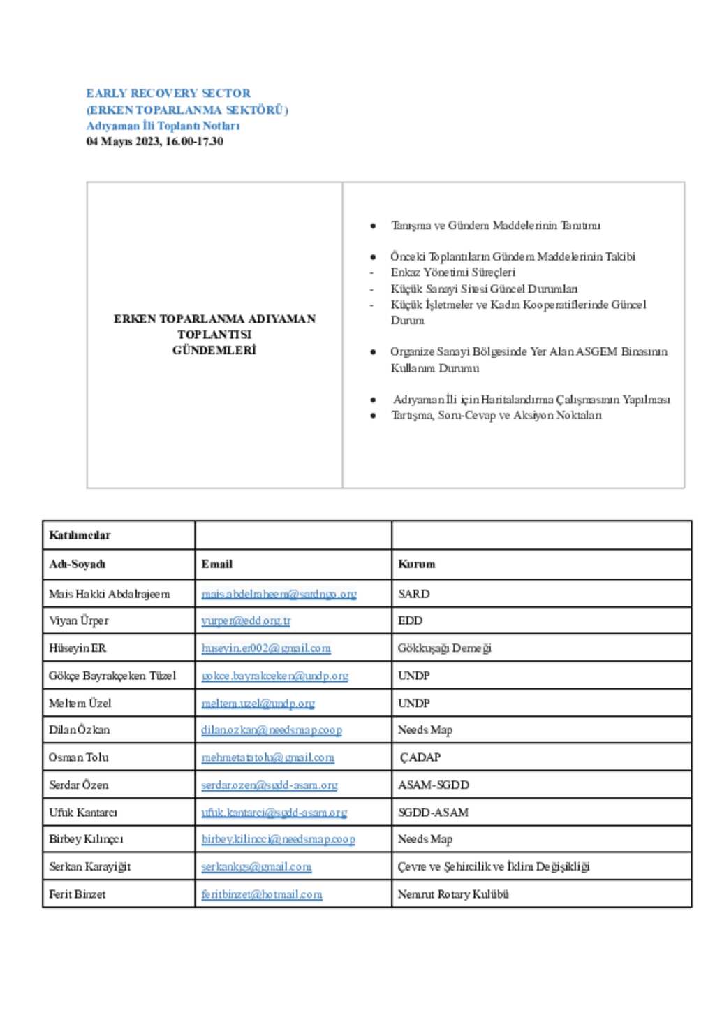 Türkiye: Adiyaman Hub Early Recovery Sector - Meeting Minutes - 4 May 2023 (TR)