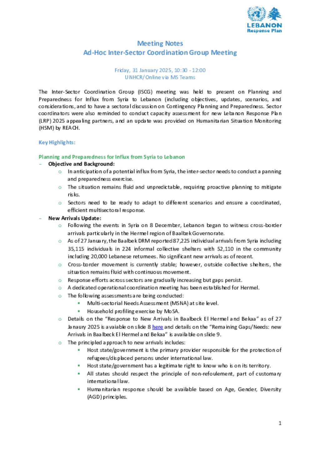 Lebanon: Ad-Hoc Inter-Sector Coordination Group Meeting Notes - 31 January 2025