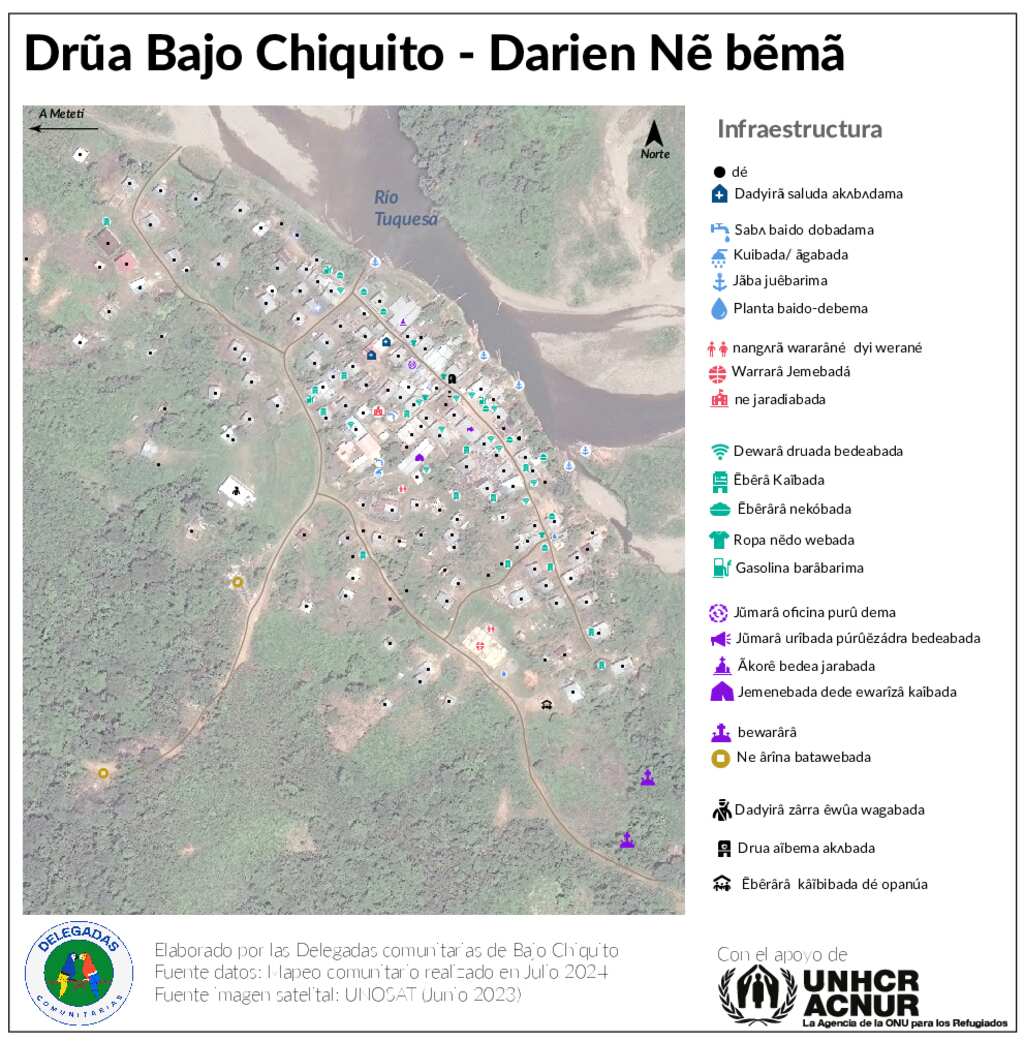 Mapa realizado por las delegadas comunitarias de la comunidad Embera Wounaan de Bajo Chiquito, a través de la iniciativa de protección basada en la comunidad apoyada por el ACNUR y con el apoyo del Fondo de Innovación de ACNUR