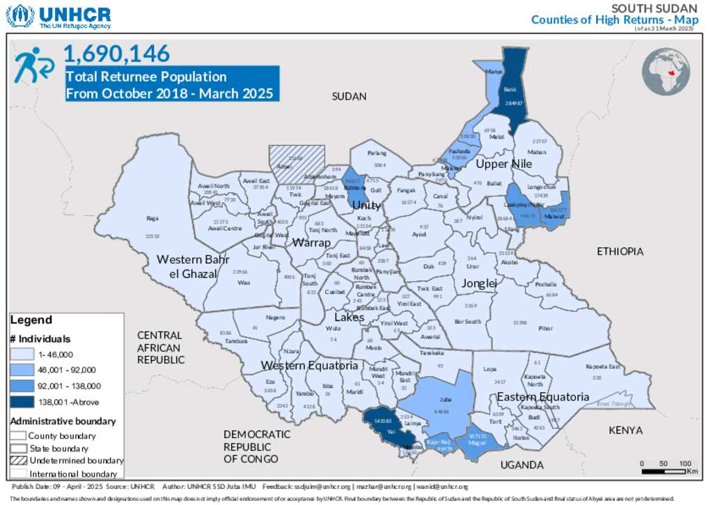 South Sudan Returnees Counties Level Heat Map - March 2025
