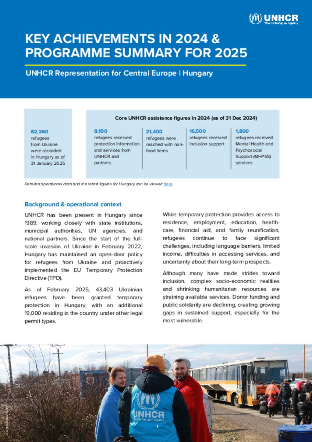 This document presents UNHCR’s key achievements in Hungary in 2024 and outlines programme priorities for 2025. It highlights the protection and inclusion support provided to refugees from Ukraine in 2024, including legal aid, mental health and psychosocial support, and integration assistance. It also reflects the operational challenges caused by significant funding cuts, which have affected the scale and continuity of services. The document further includes UNHCR’s strategic focus for 2025 in Hungary: a shift from emergency response to longer-term inclusion, with emphasis on strengthening national systems, expanding local partnerships, and prioritizing support for the most vulnerable.