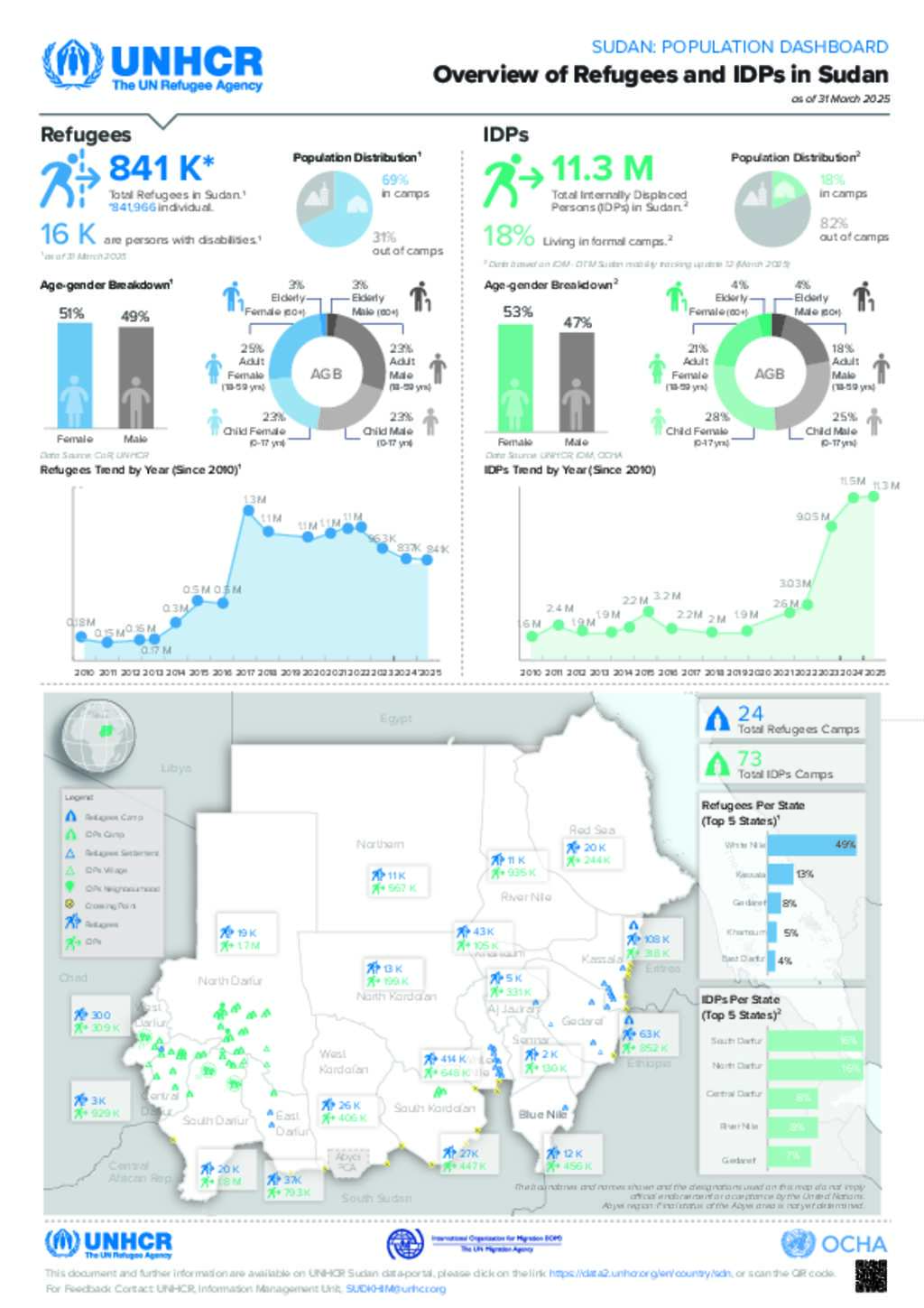 UNHCR Sudan - Overview of Refugees and IDPs in Sudan Dashboard as of 31 March 2025