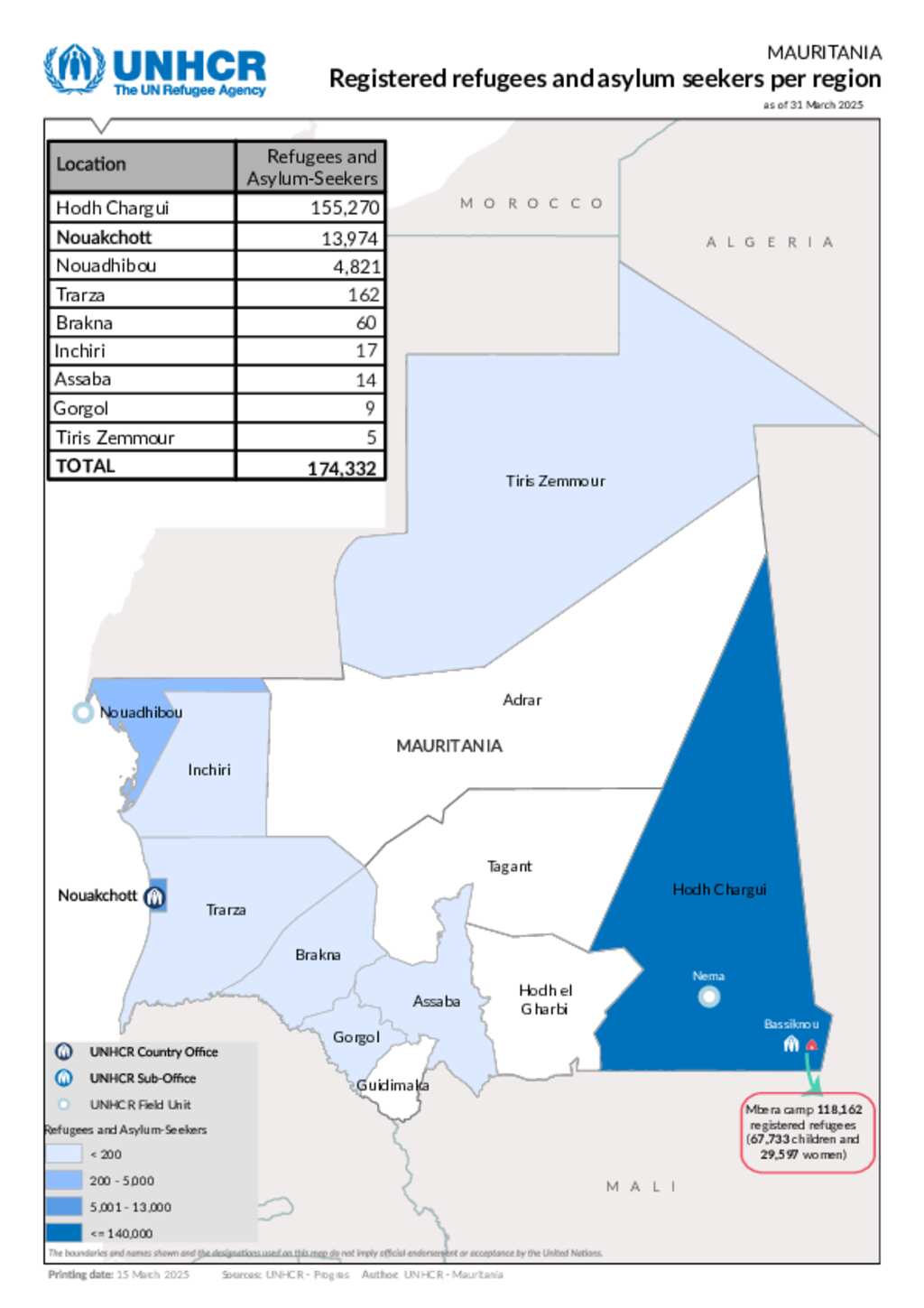 UNHCR Mauritania Registered refugees and asylum seekers per region as of 31 March 2025