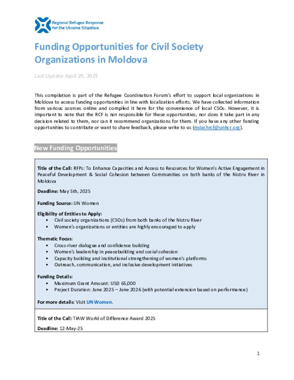 Ukraine Situation - Moldova: Funding Opportunities for Local CSOs in Moldova (April 2025) (EN)