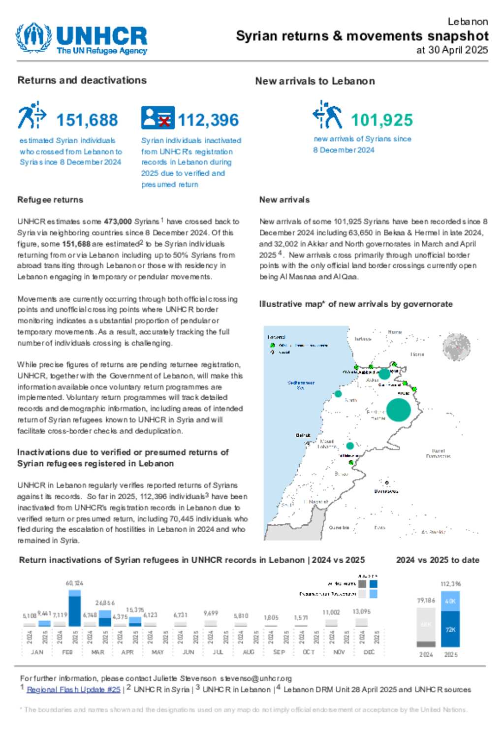 UNHCR Lebanon - snapshot on cross border movements, refugee returns to Syria and inactivations of Syrian refugees from UNHCR records in Lebanon as well as new arrivals to Lebanon since 8 December 2024.