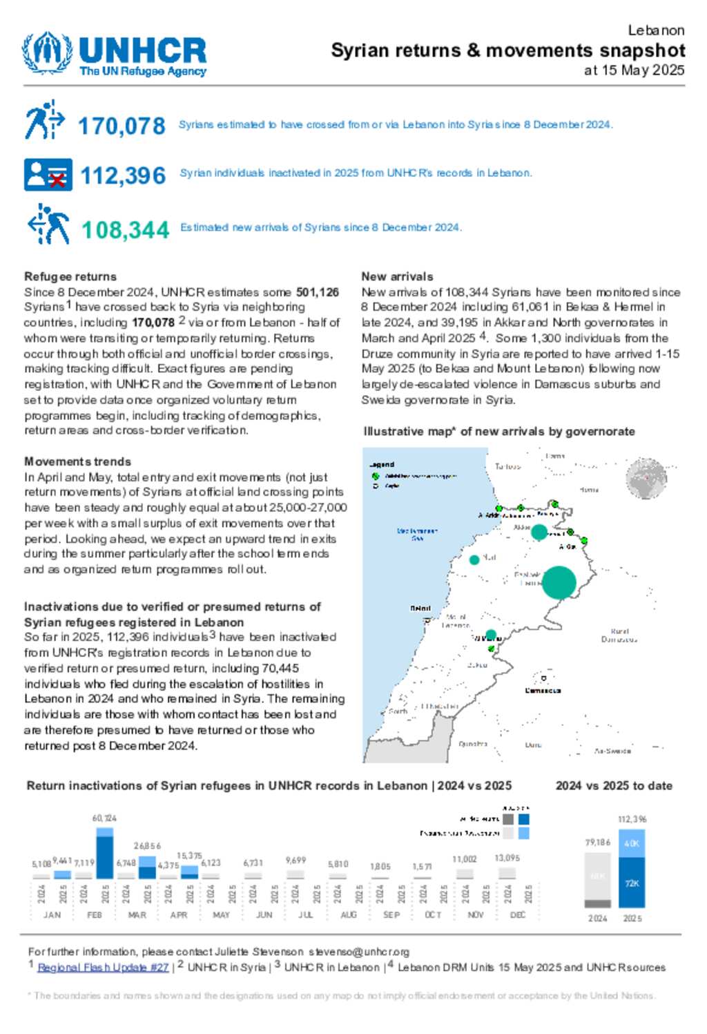 UNHCR Lebanon - snapshot on cross border movements, refugee returns to Syria and inactivations of Syrian refugees from UNHCR records in Lebanon as well as new arrivals to Lebanon since 8 December 2024.