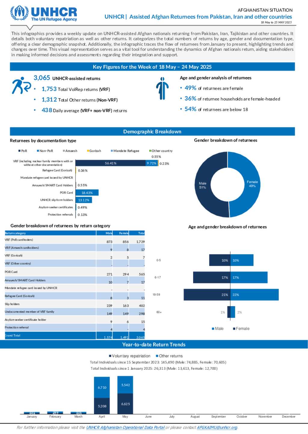 This dashboard provides a weekly update on UNHCR-assisted Afghan nationals returning from Pakistan. It details both voluntary repatriation as well as forced returns. It categorizes the total numbers of returns by age, gender and documentation type, offering a clear demographic snapshot. Additionally, the infographic traces the flow of returnees from January to present, highlighting trends and changes over time. This visual representation serves as a vital tool for understanding the dynamics of Afghan nationals return, aiding stakeholders in making informed decisions and assessments regarding their integration and support.