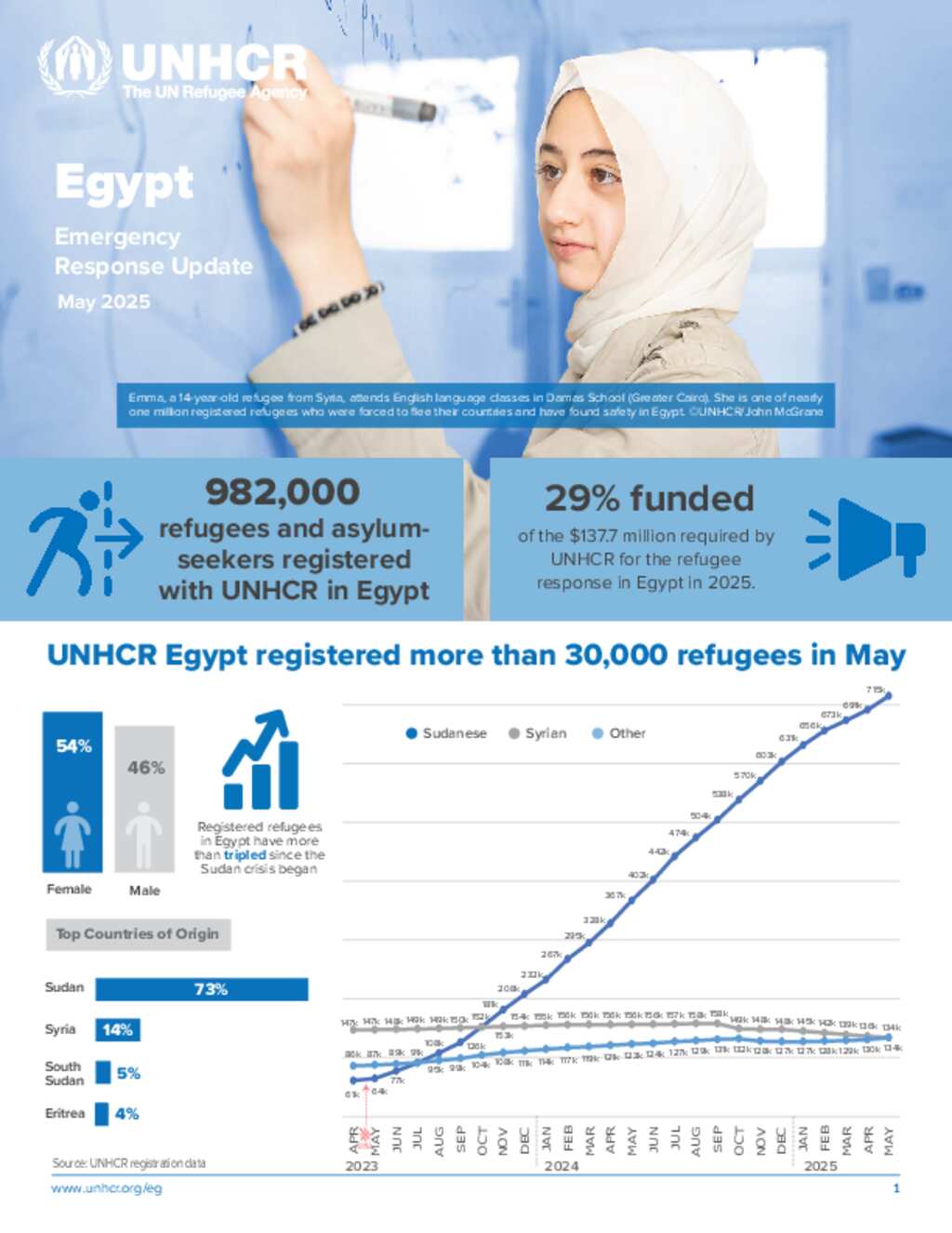 Monthly report outlining the progress of UNHCR's work in Egypt regarding the protection and assistance of refugees and asylum-seekers.